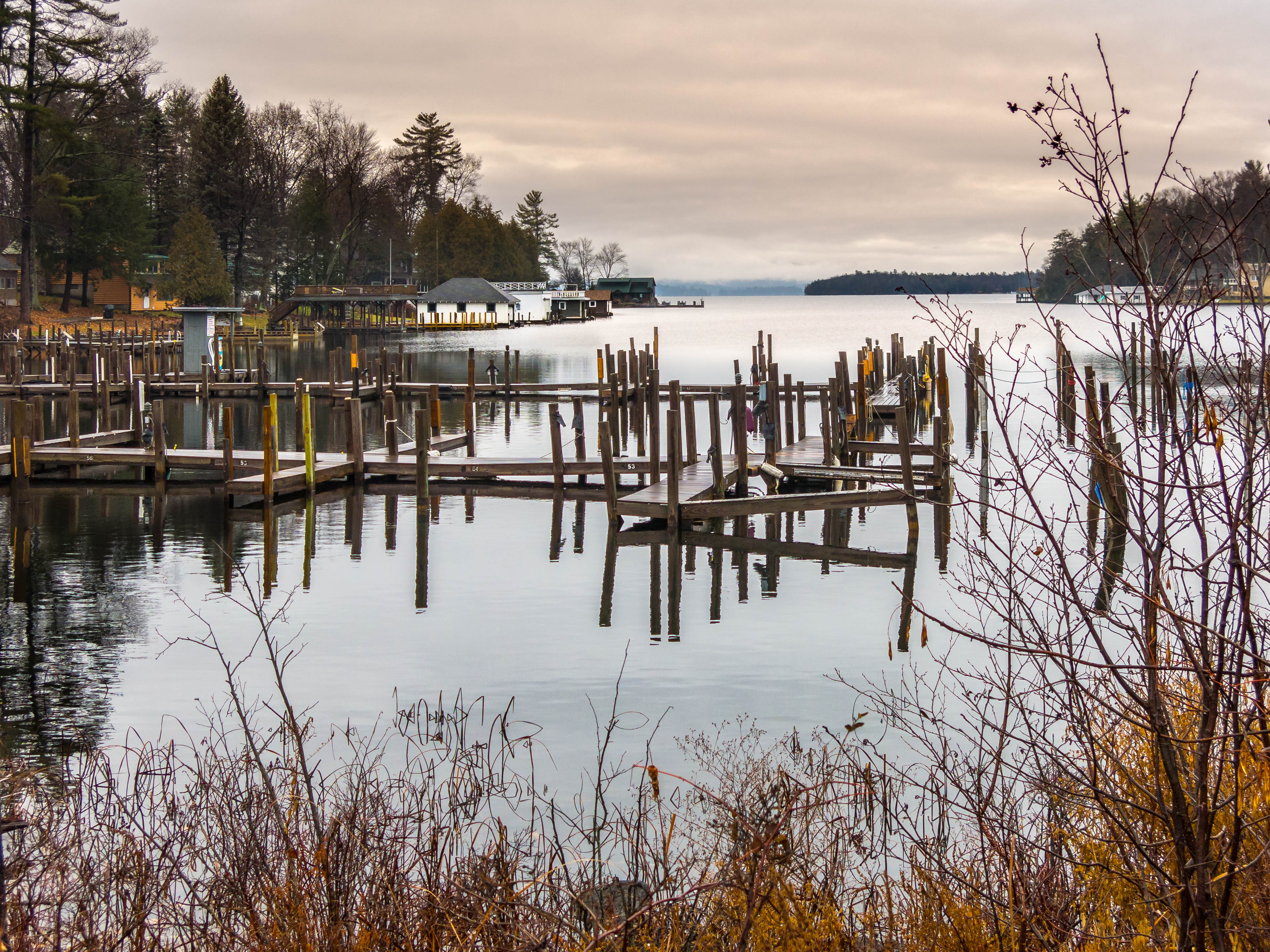 The piers with overcast skies and pilons and boat docks on a lake in the Champlain Valley, rural Vermont.