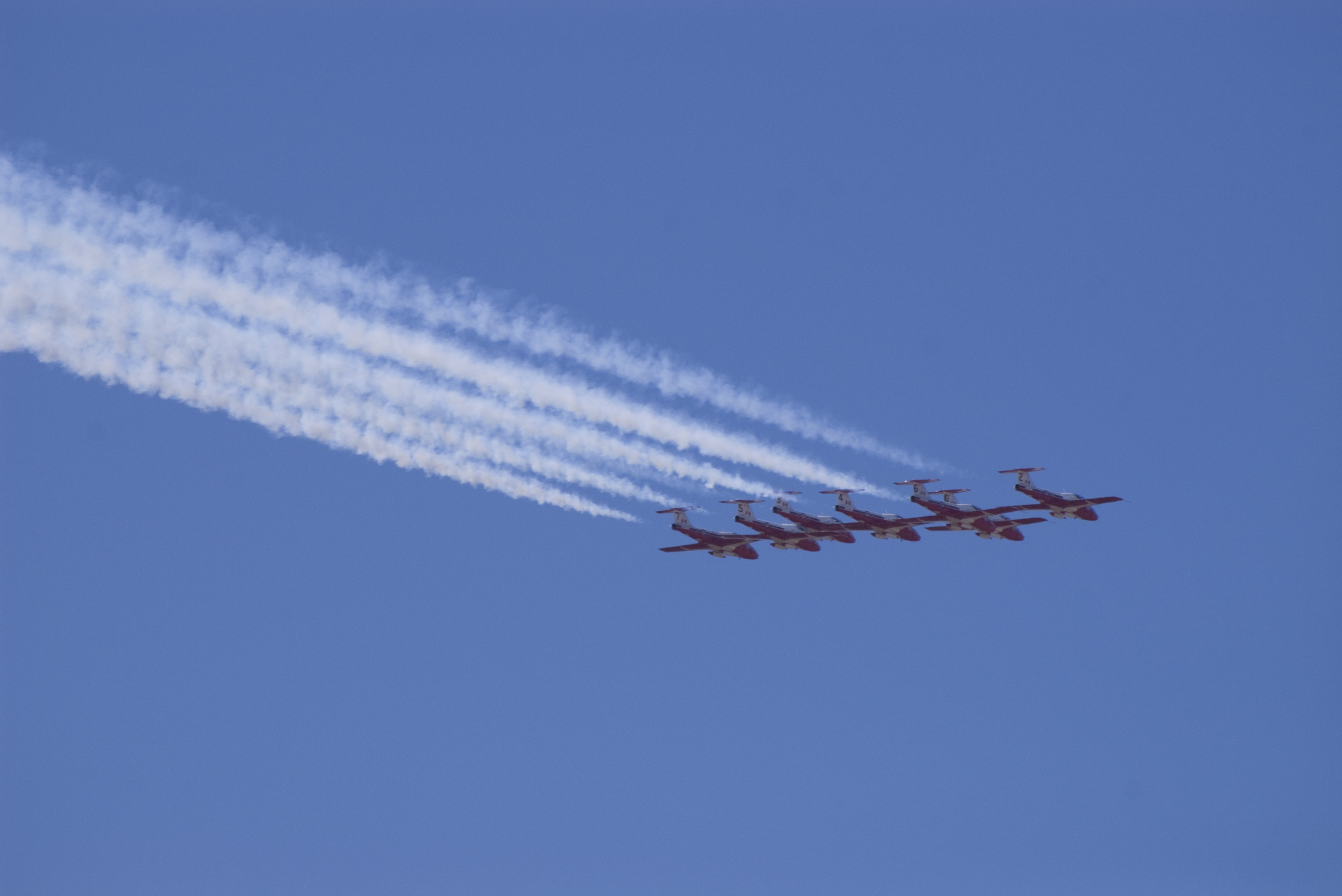 Keywords: show, display, formation, red, white, jet trail, vapour trail, smoke, red, line, sky, planes, flying