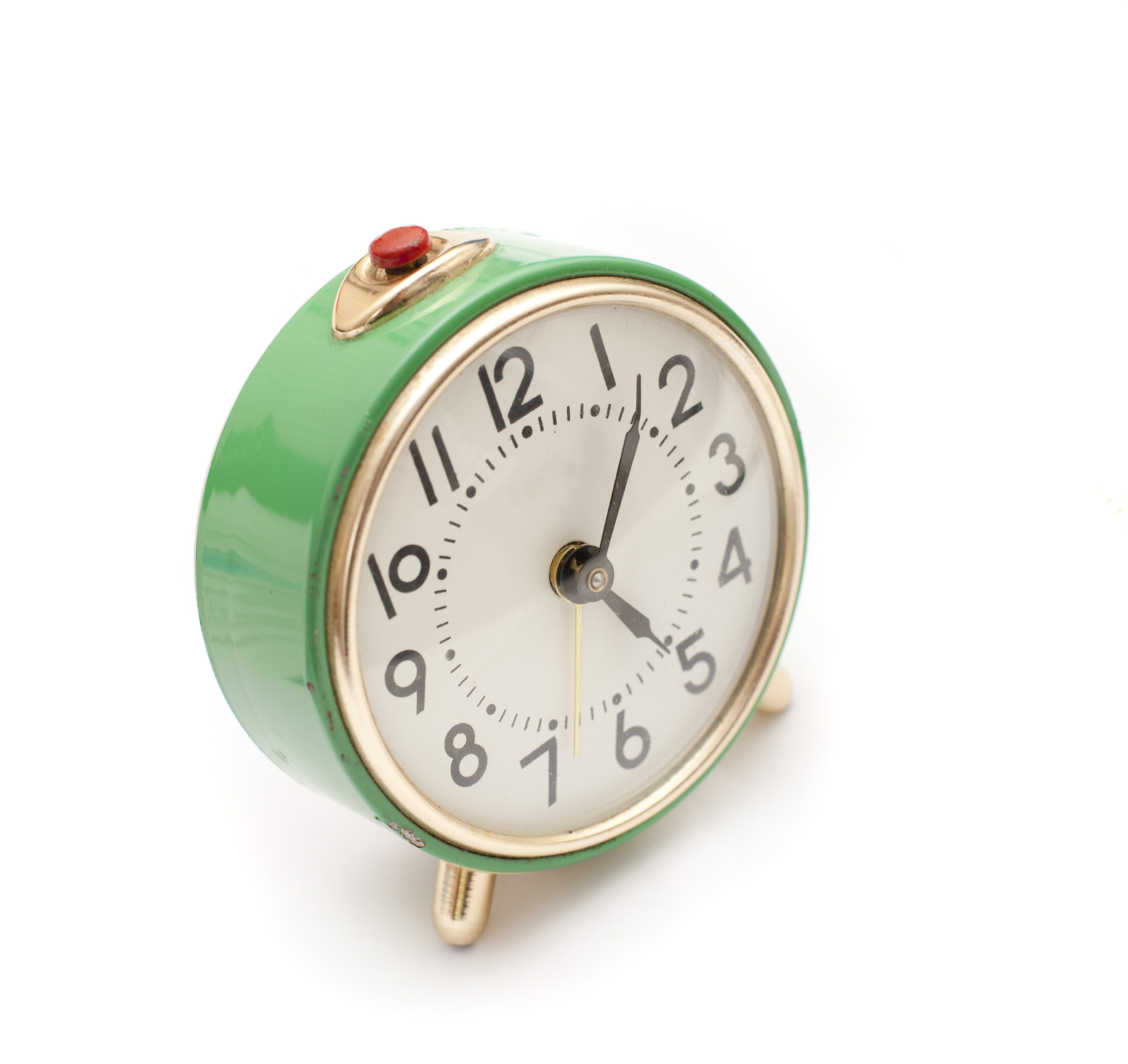 Round green metal alarm clock with a red button to deactivate the ring at the top and Arabic numerals on a white background
