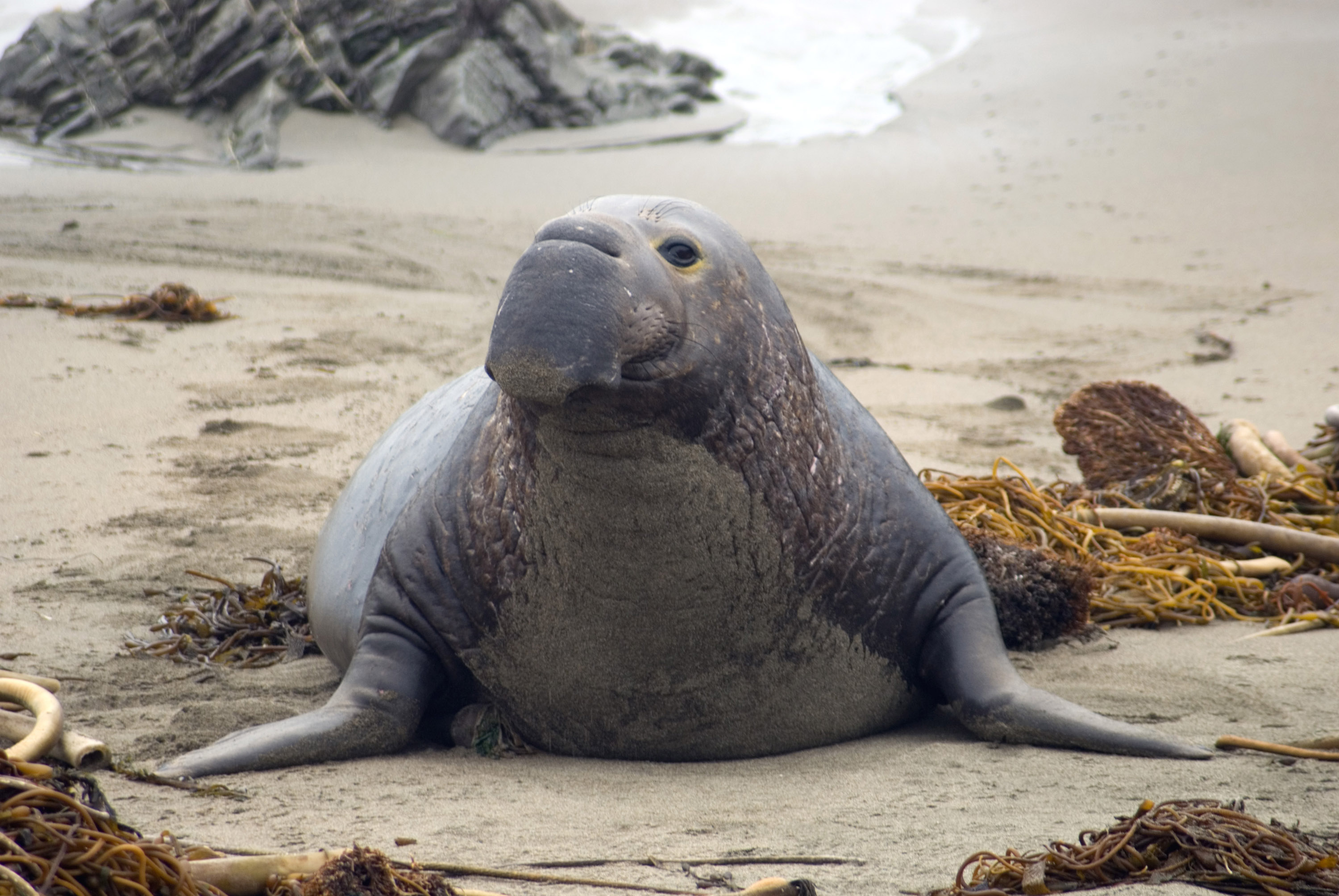 Keywords: califonia coast, seal, seals, grey, white, elephant, sea cow, elephant seal, fins, flippers, standing, looking, on guard, animal
