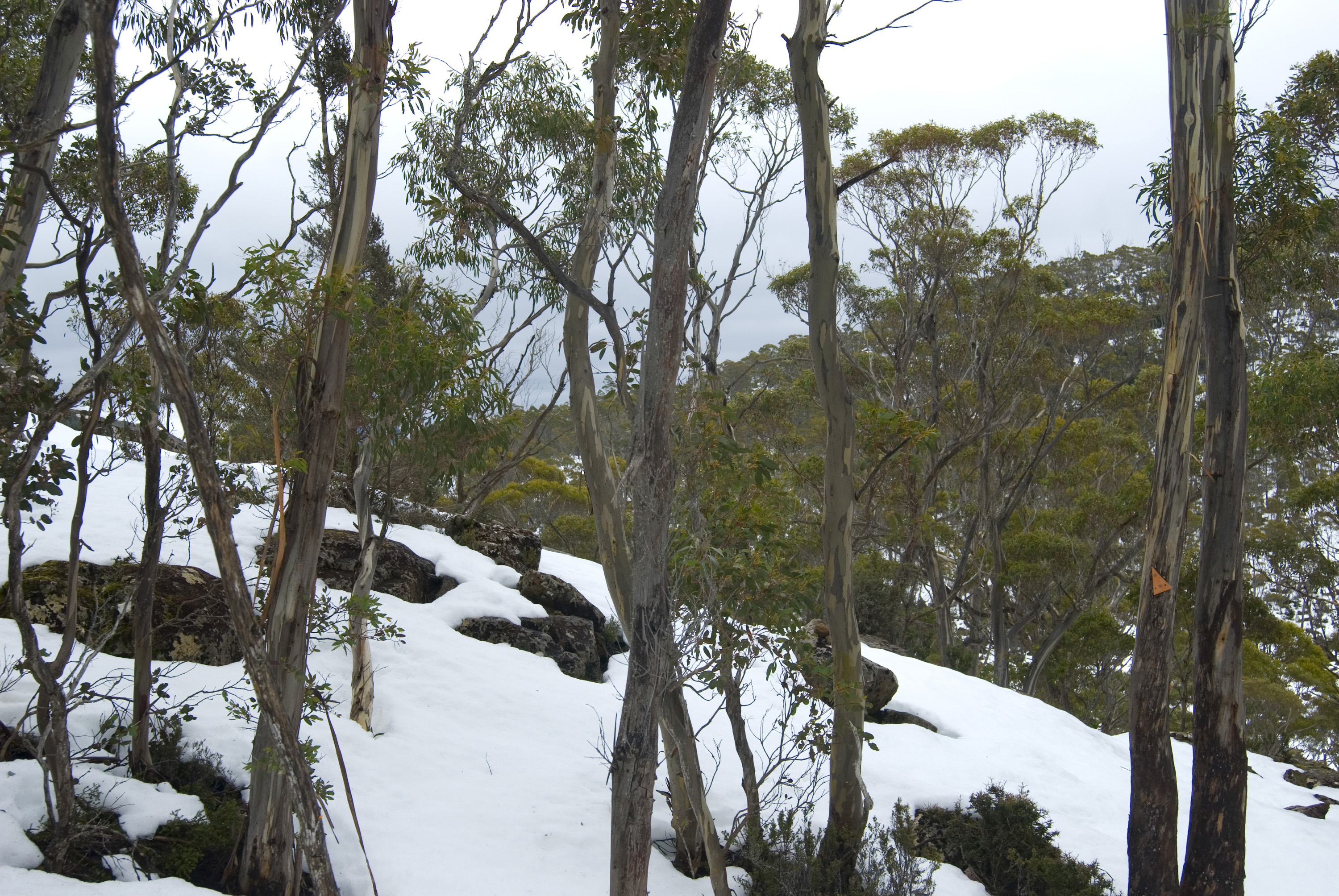 Keywords: tasmania, australia, winter, snow, mountain, season, cold, freezing, snowfall, gum, eucalyptus, tree, trunk, weather, climate