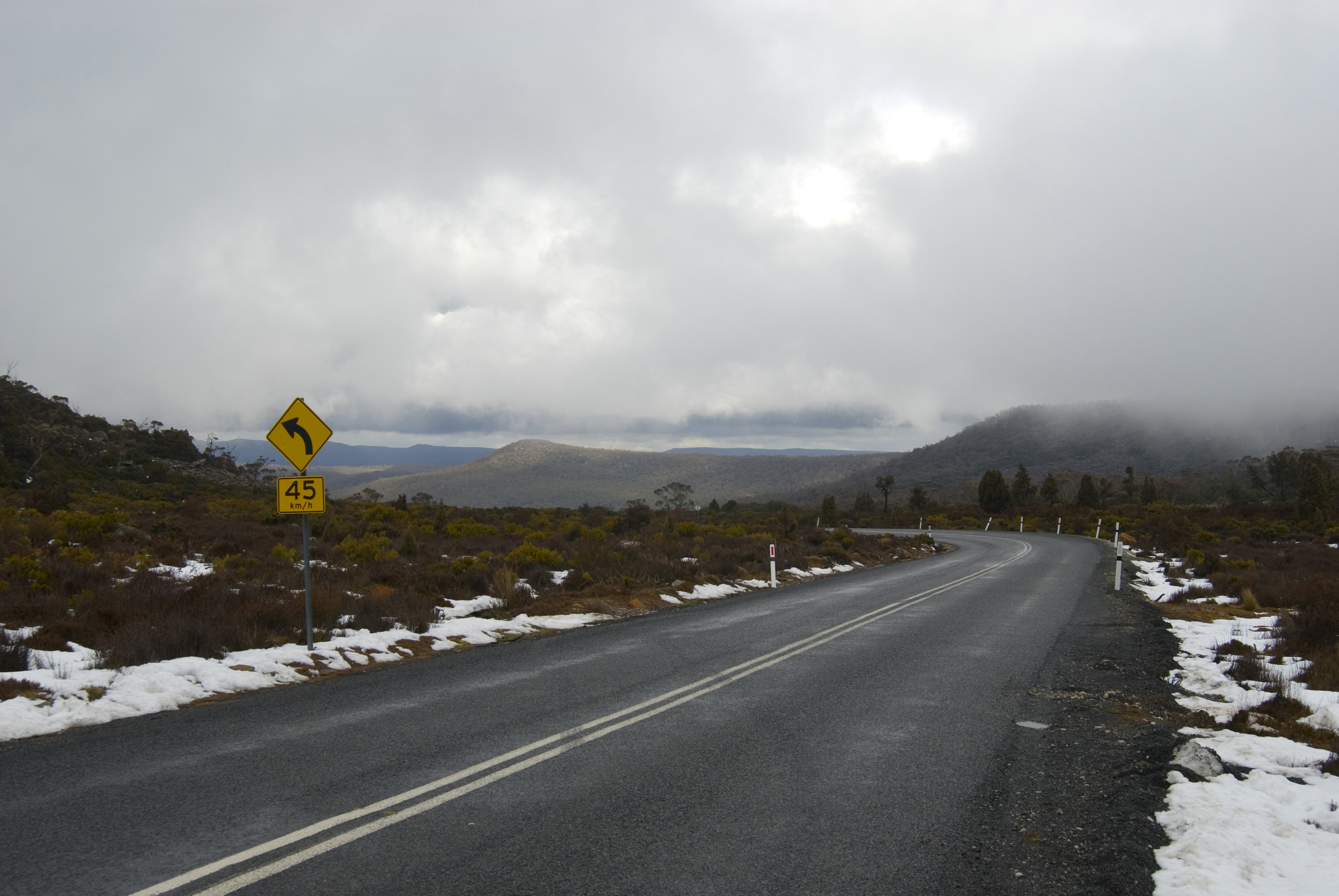 Keywords: travel, winter, snow, transportation, mountains, road, paved, curve, caution, highway, highland, australia, overcast, tasmania, lakes