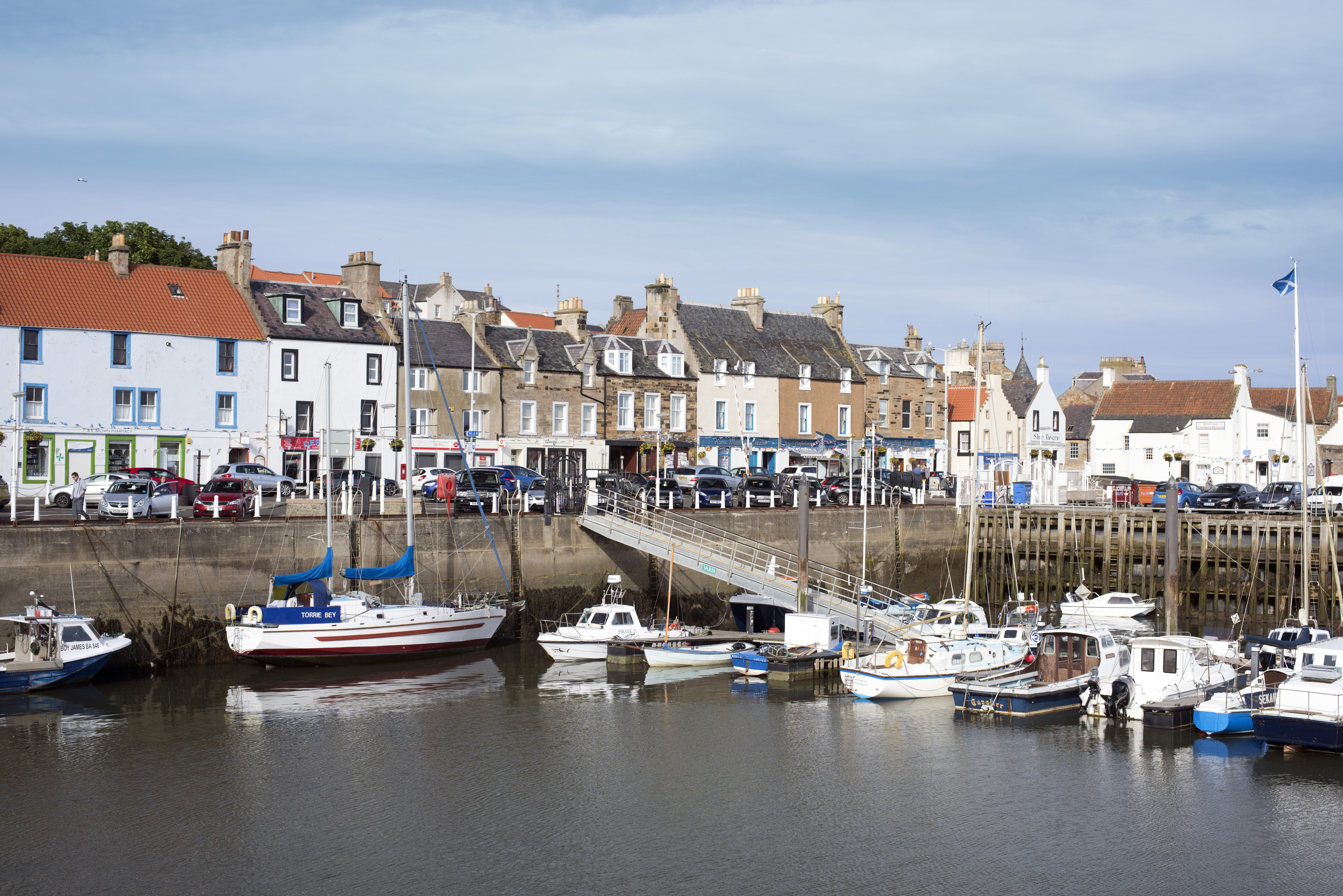 View from across the water of various docked boats at pier in Anstruther, Scotland