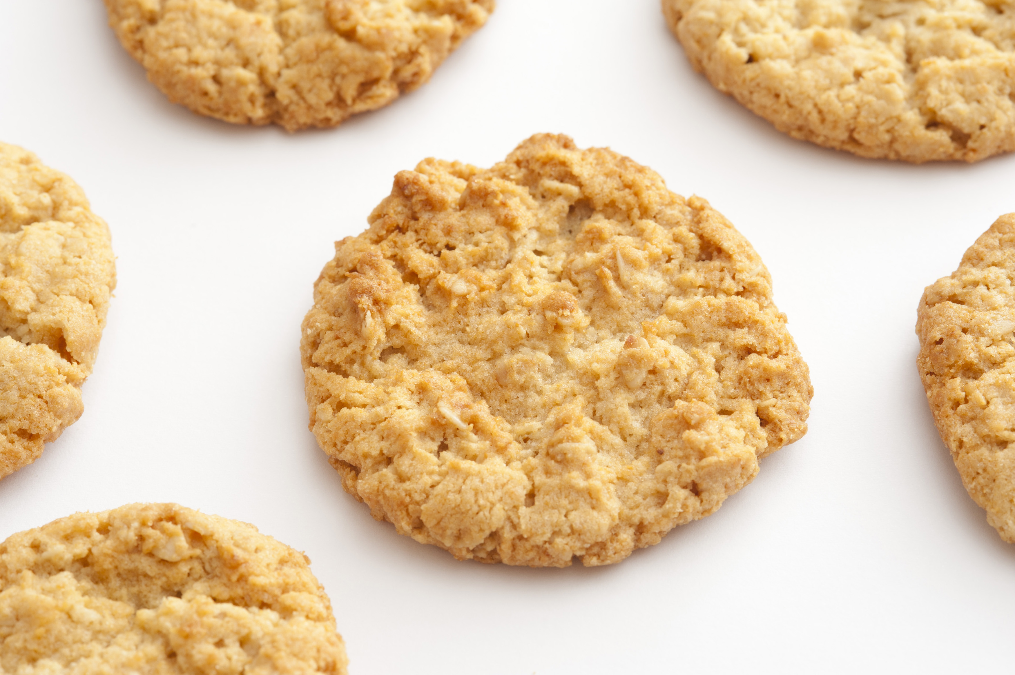 Fresh homemade Anzac biscuits with rolled oats and coconut arranged spread out on white with focus to the centre biscuit