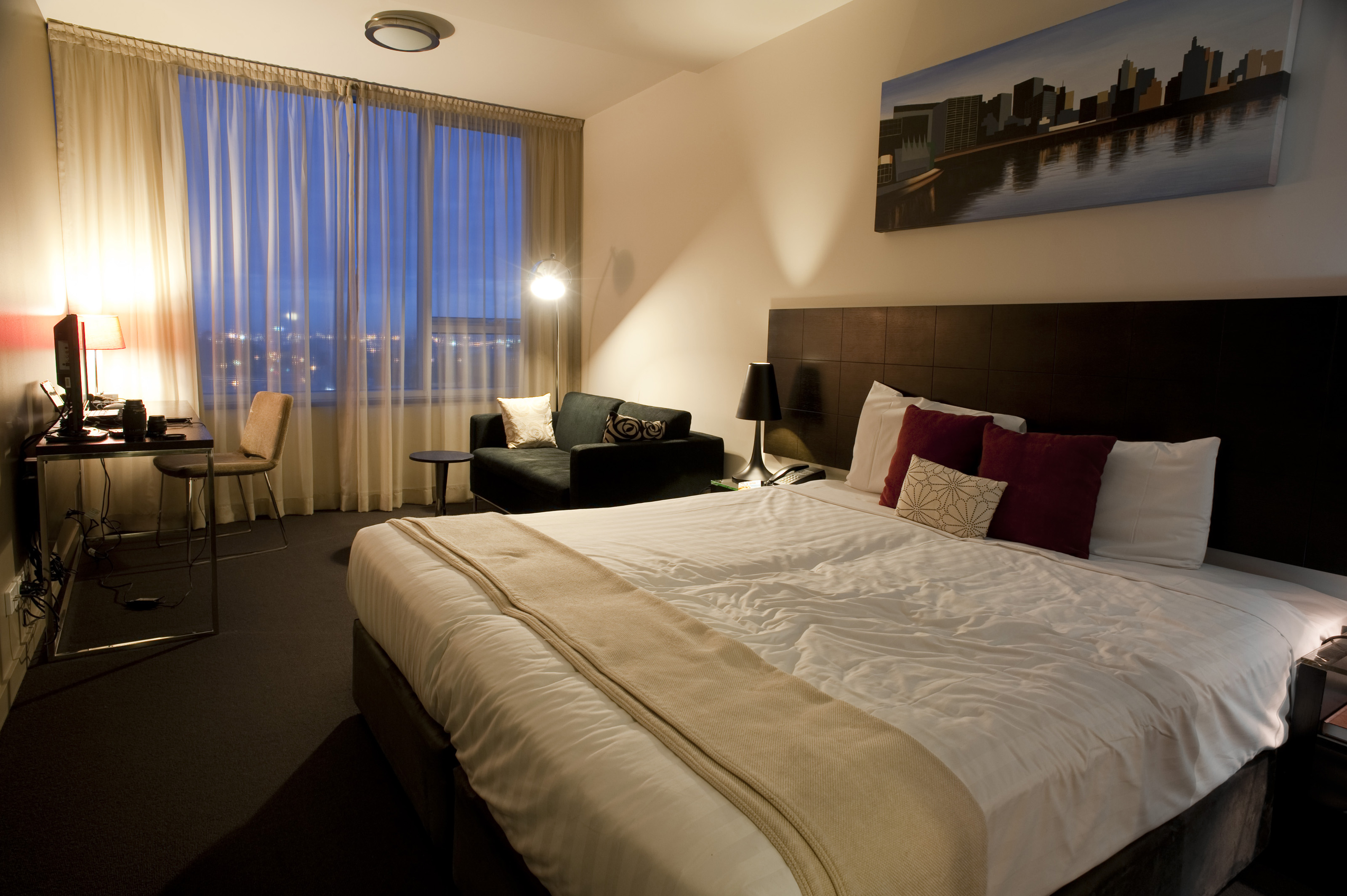 Large comfortable apartment bedroom with a very large bed, desk and armchair and a view window overlooking urban lights