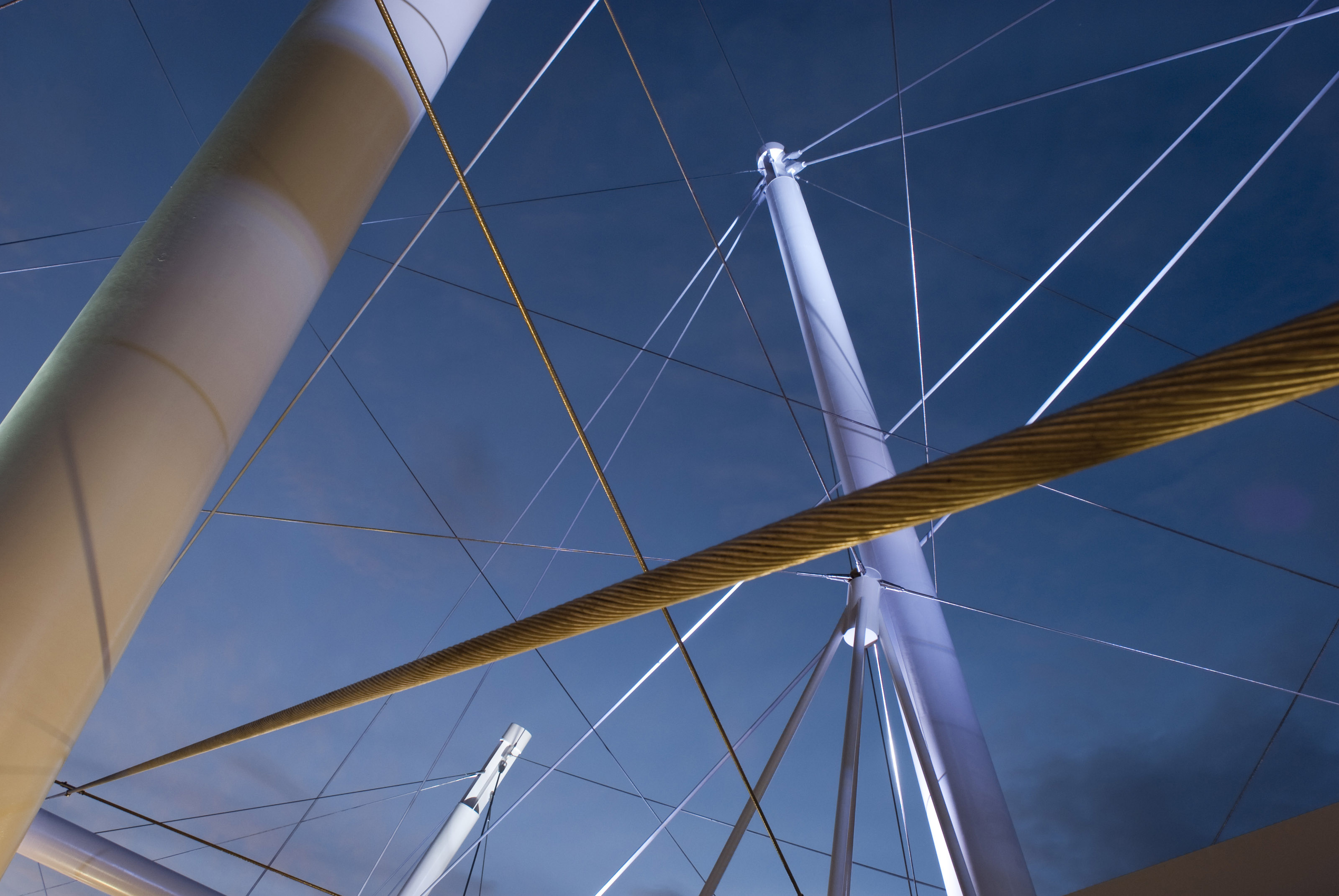 Architectural steel with a network of poles, stays and cables against a blue sunny sky
