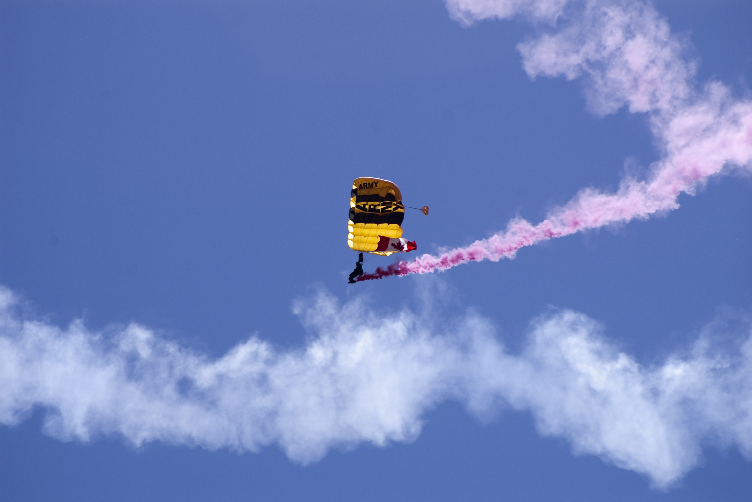Keywords: army, paratroop, parachute, pink smoke, glide, yellow