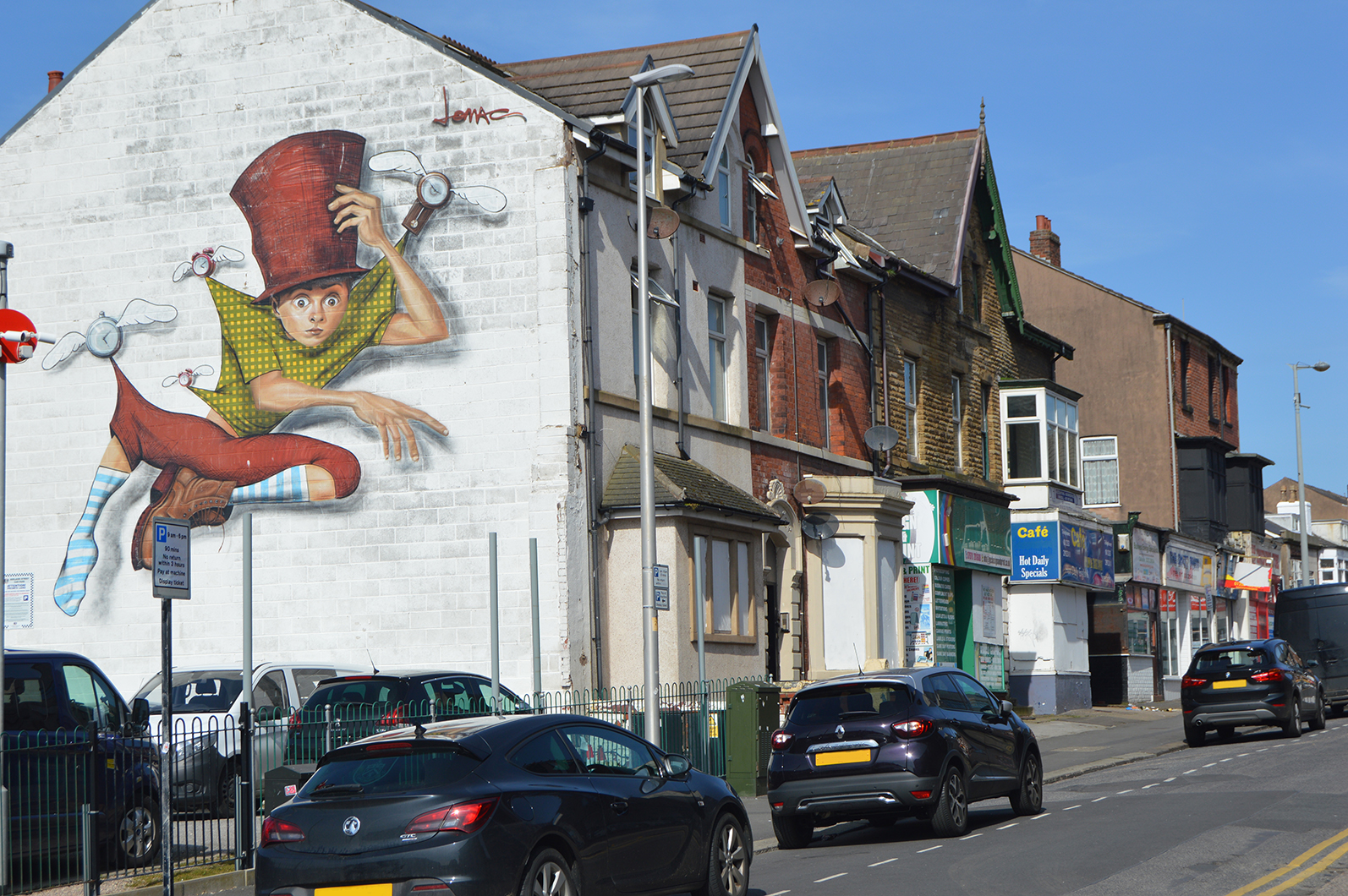 Street Art / graffiti art in Blackpool. The Sand, Sea and Spray, Urban Art Event held in Blackpool, Lancashire. UK. See more artworks like this at https://books.apple.com/gb/book/graffiti-art/id1439944363