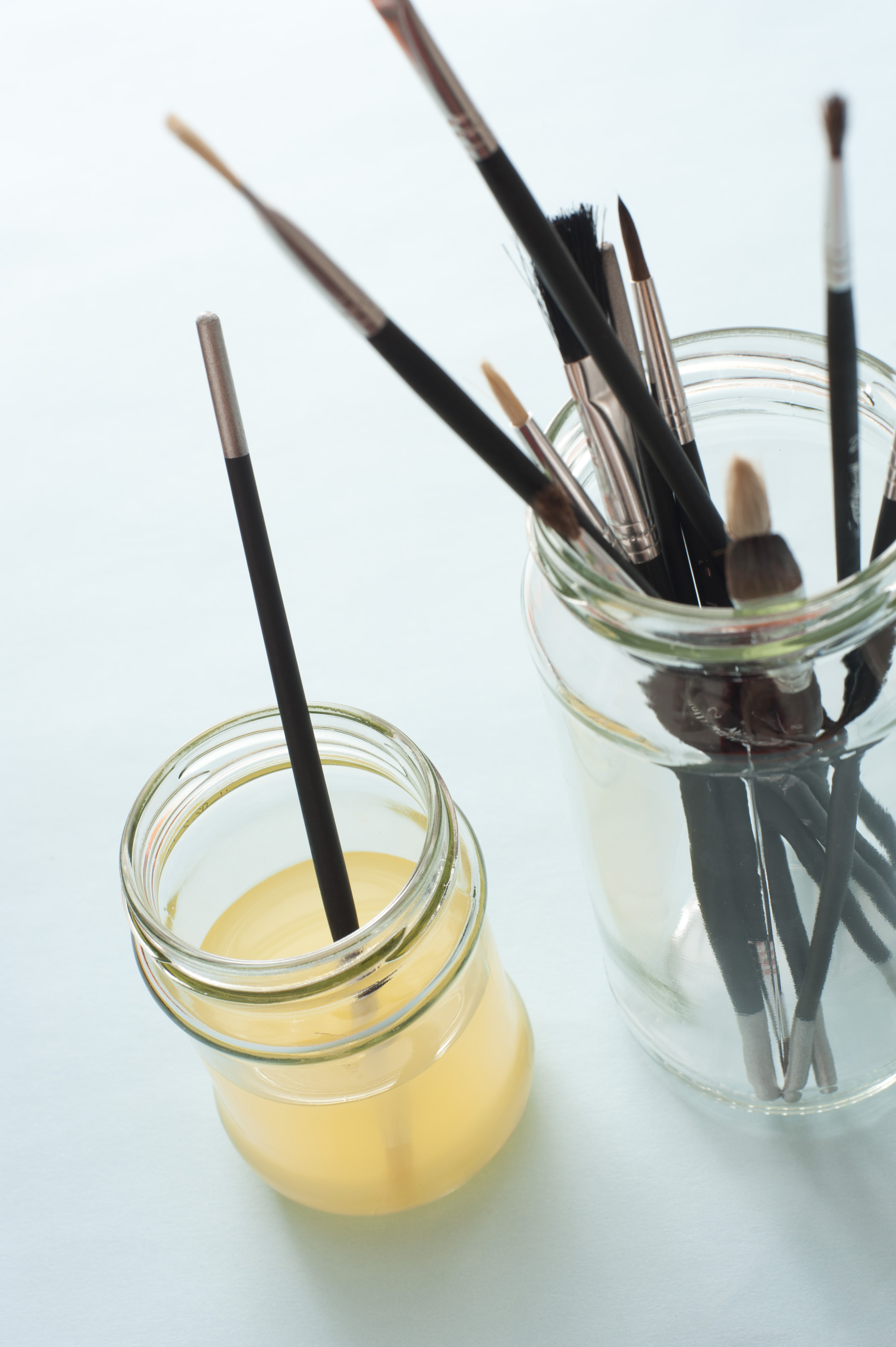 Single brush in cloudy water wash next to taller jar of various dry paintbrushes