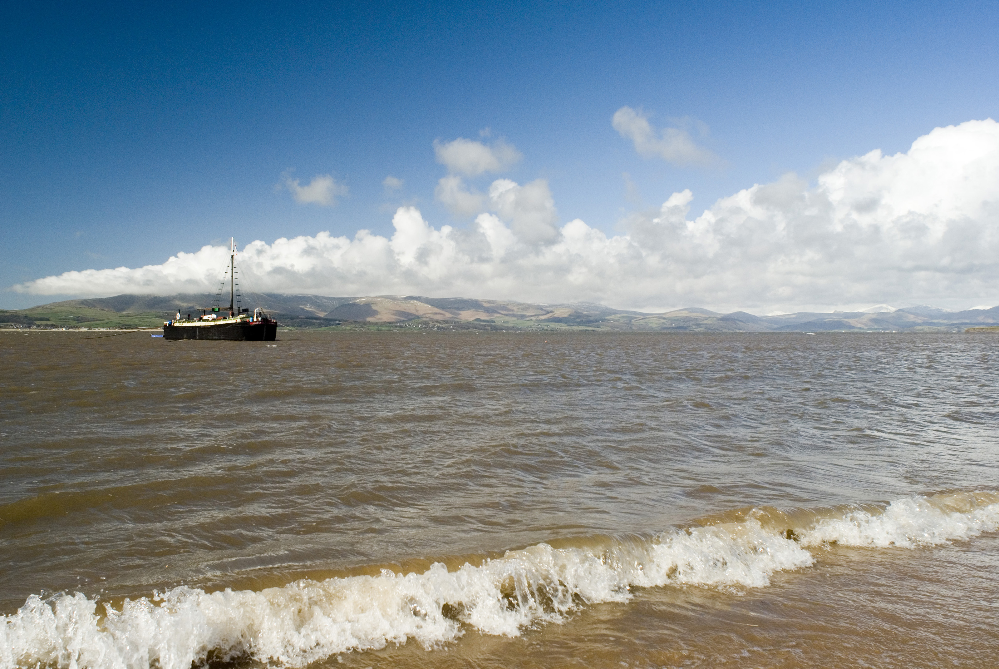 Keywords: uk, england, estuary, askam, duddon, europe, sea, wave, ship, seashore, navigation, travel, transportation, boat, destination, maritime, beach, sand, foam, horizon