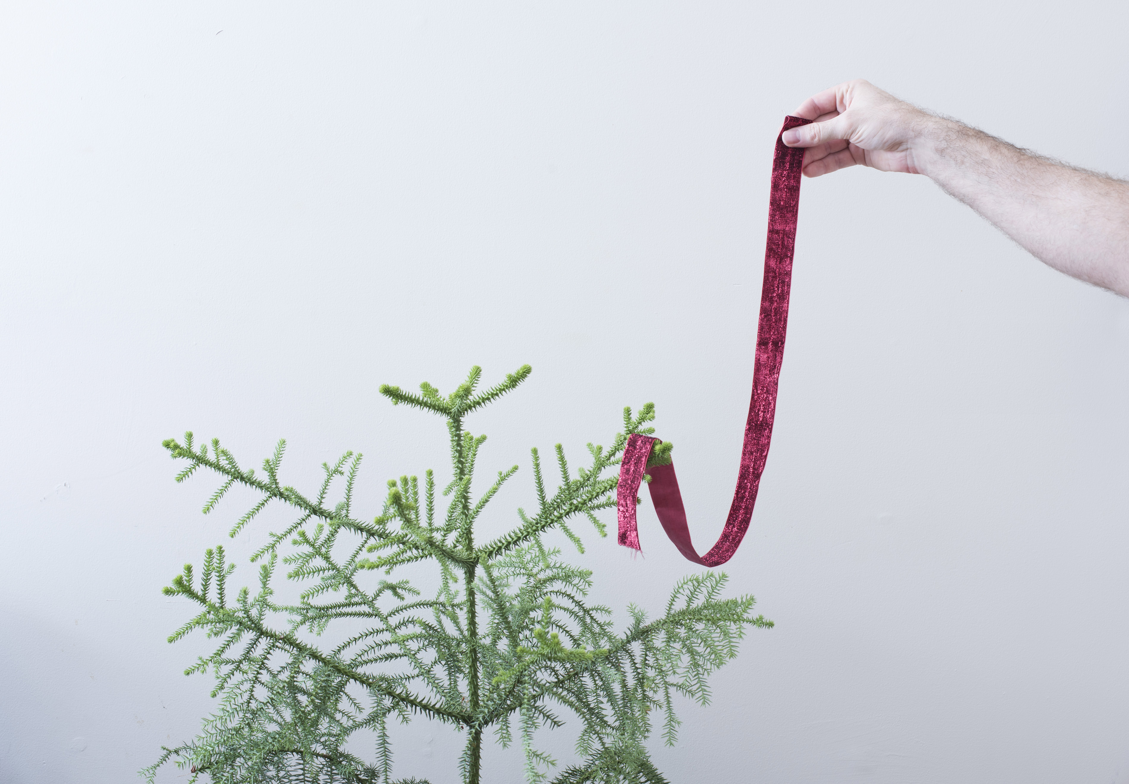 Keywords: celebration, christmas, festive, holiday, xmas, austere, red, ribbon, single, sparse, tree, undecorated, spartan, copy space, hand