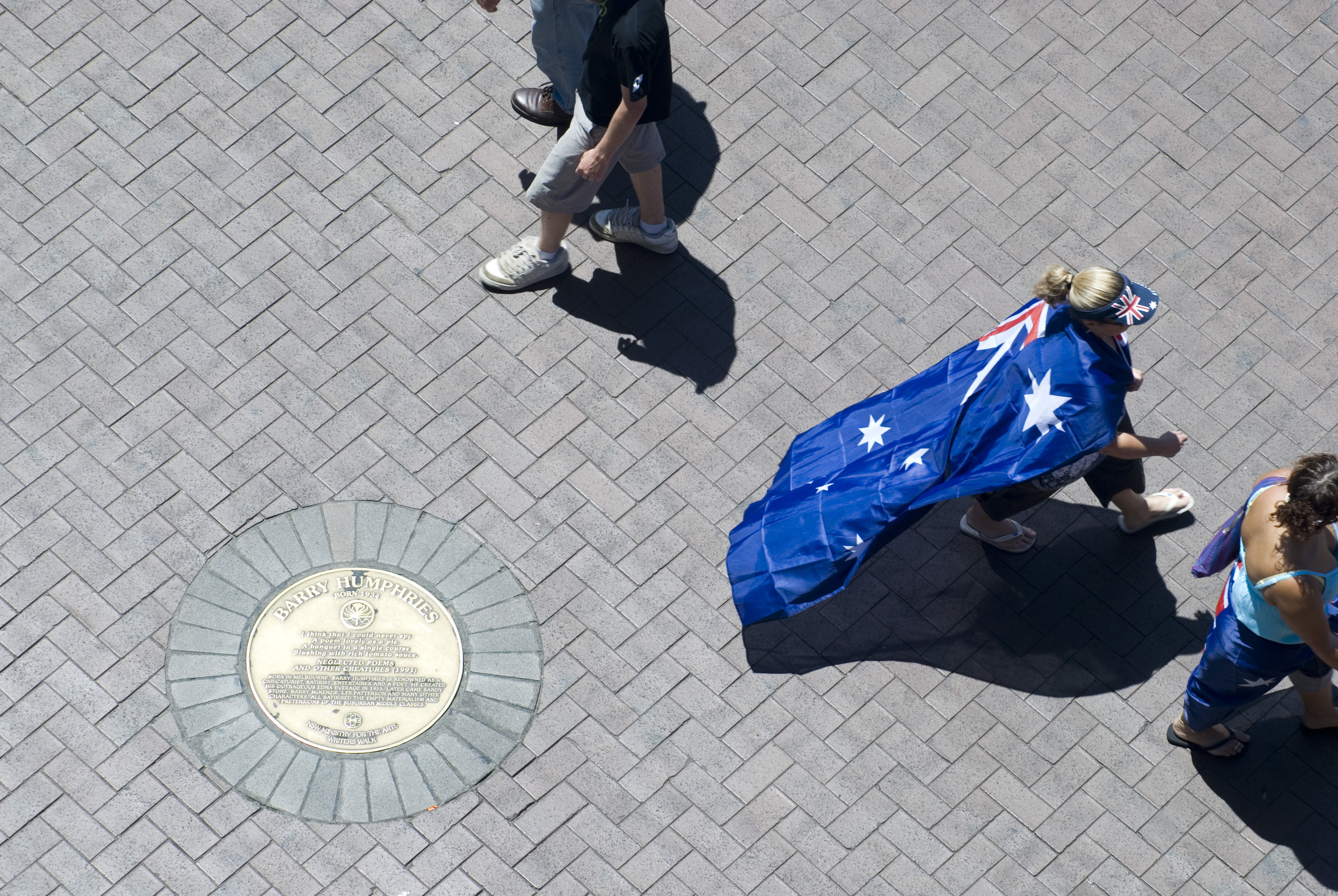 a metal plaque in the footpath at circula quay with barry humphries wirtten on it. not model released