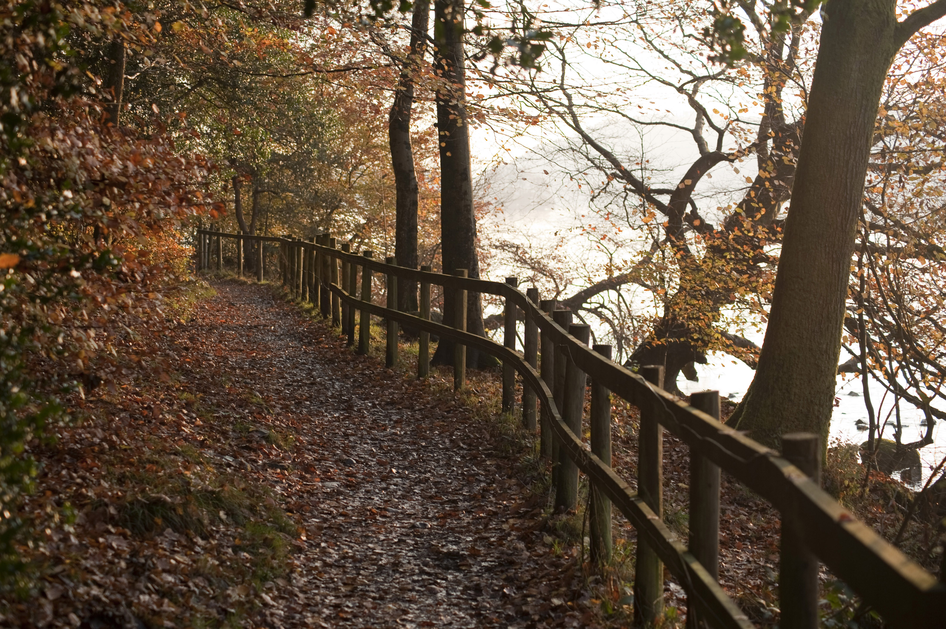 Keywords: wood, brown, green, autumn, fall, nature, plant, landscape, sky, path, sunny, trees, countryside, fence, forest
