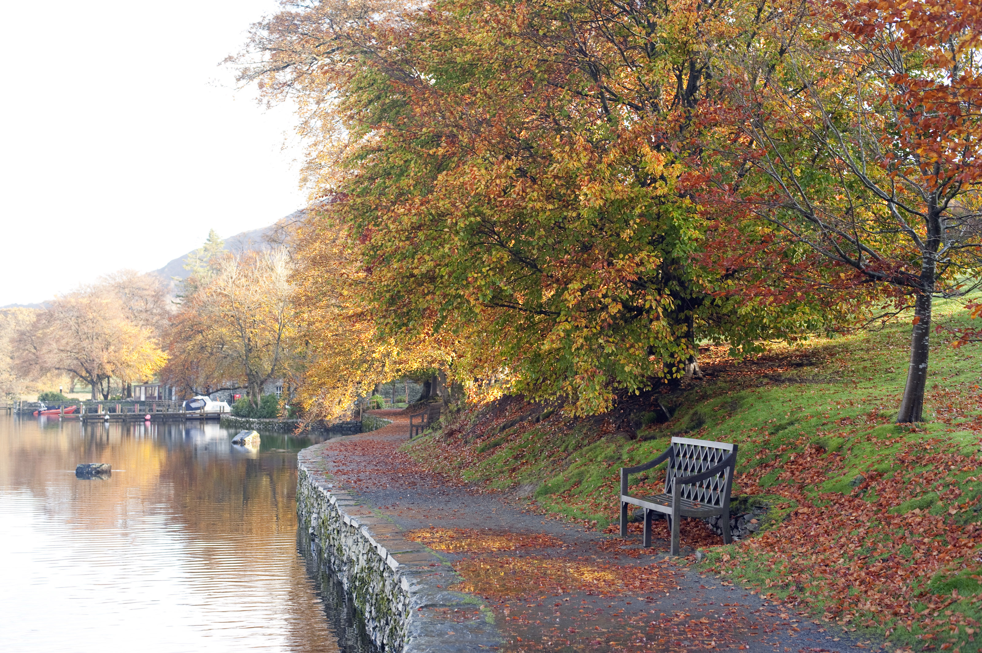 Keywords: autumn, fall, trees, scenery, colour, leaves, foliage, season, tranquil, walkway, river, bench, change, canal, waterway
