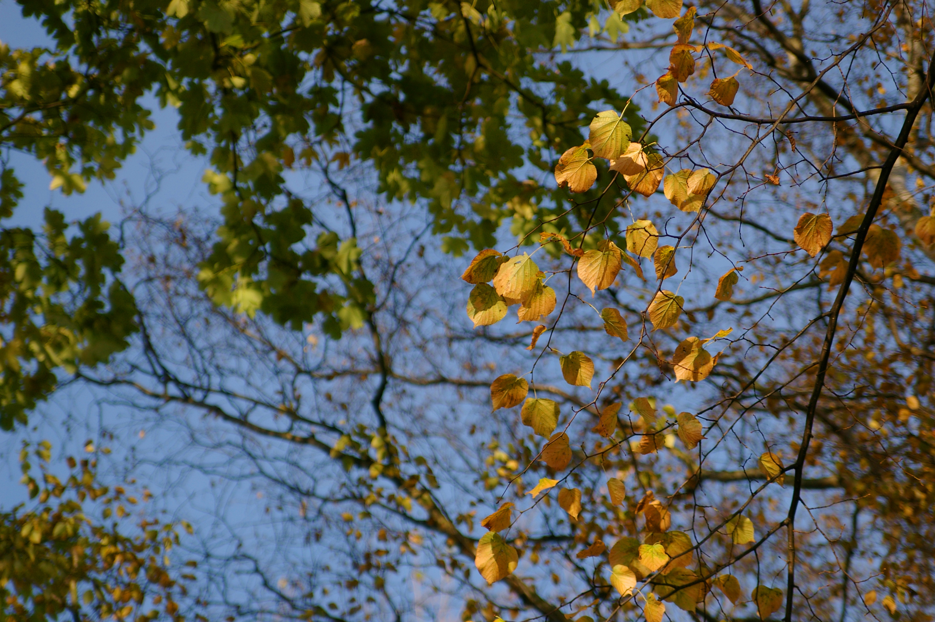 Keywords: autumn, fall, green, yellow, leaf, tree, branches, blue sky