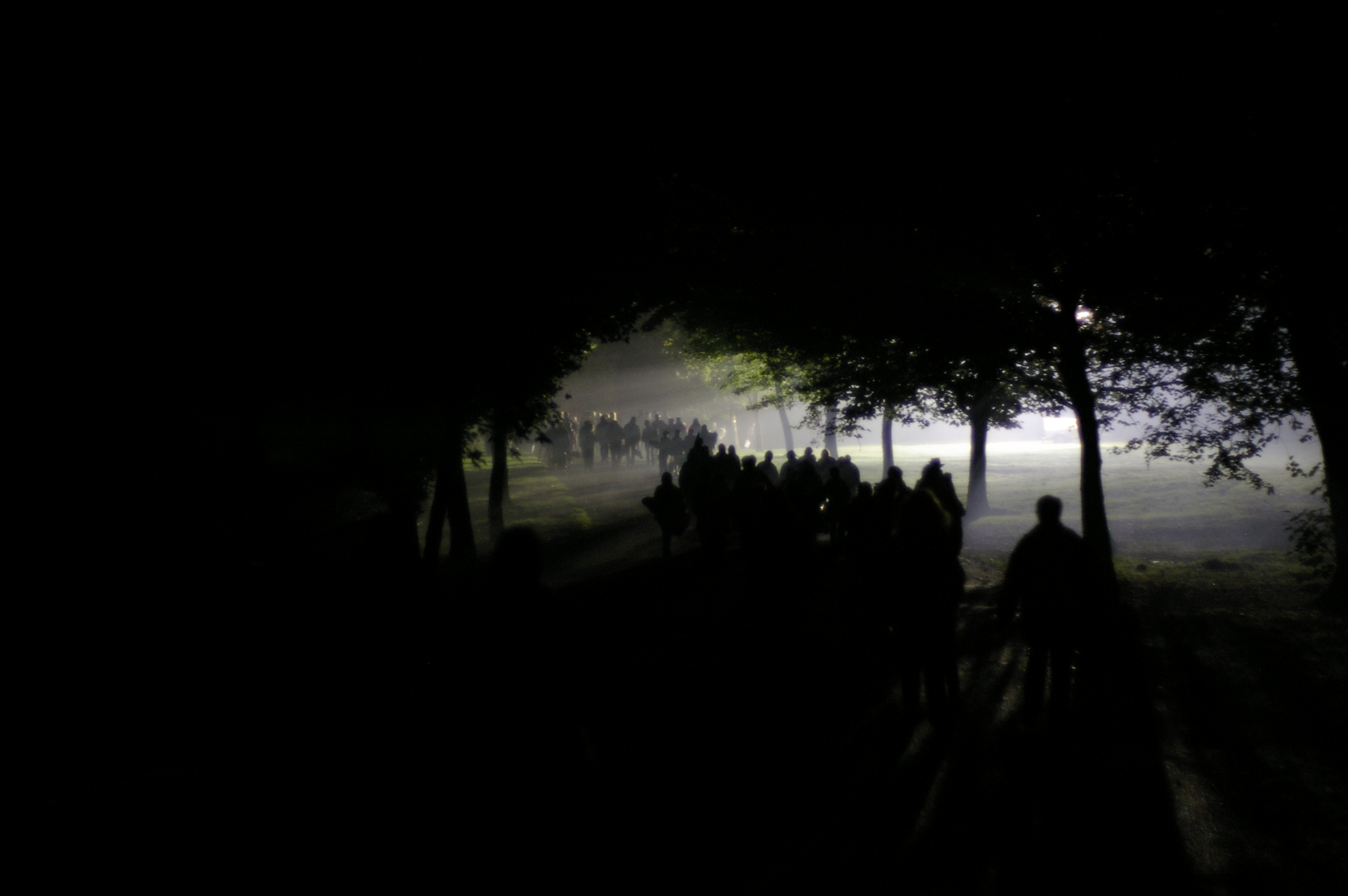 abstract and creepy nightime photography, a line of people walking through a park