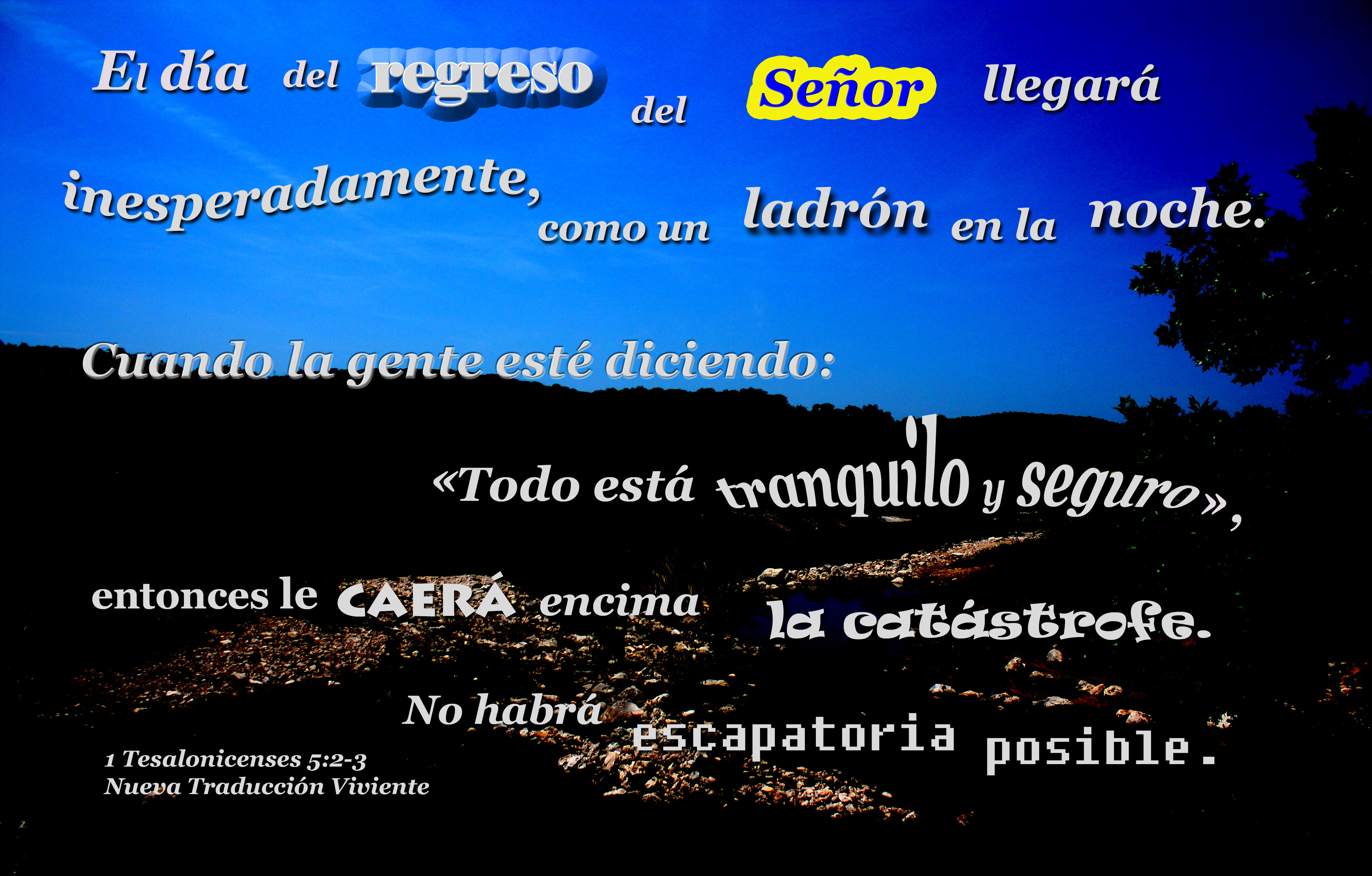 Night with lighted landscape and Bible verse about Jesus´ returnPhoto Title: El Día del Regreso del Señor