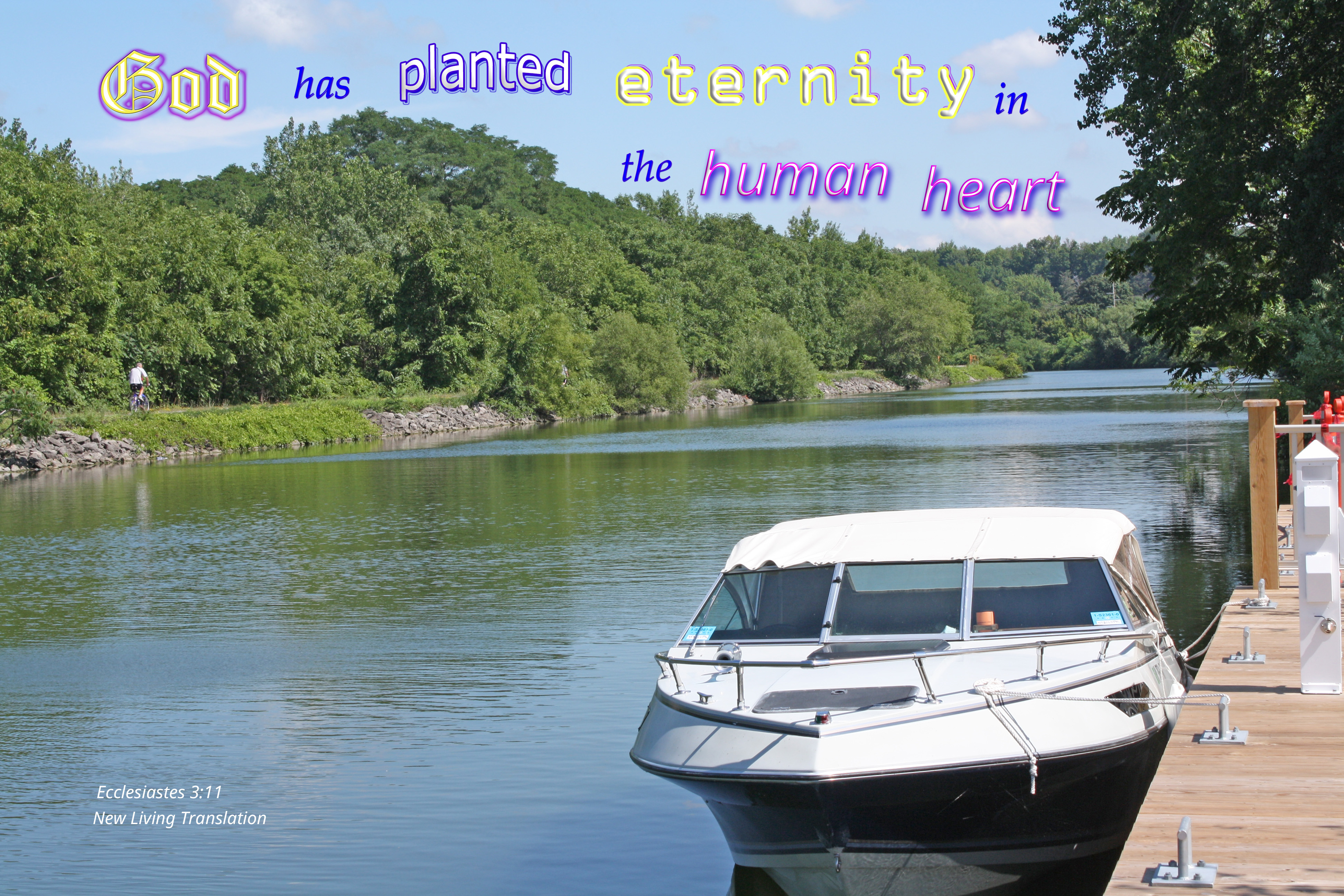 Boat and bicyclist along a canal with treesPhoto Title: Eternity in the Human Heart