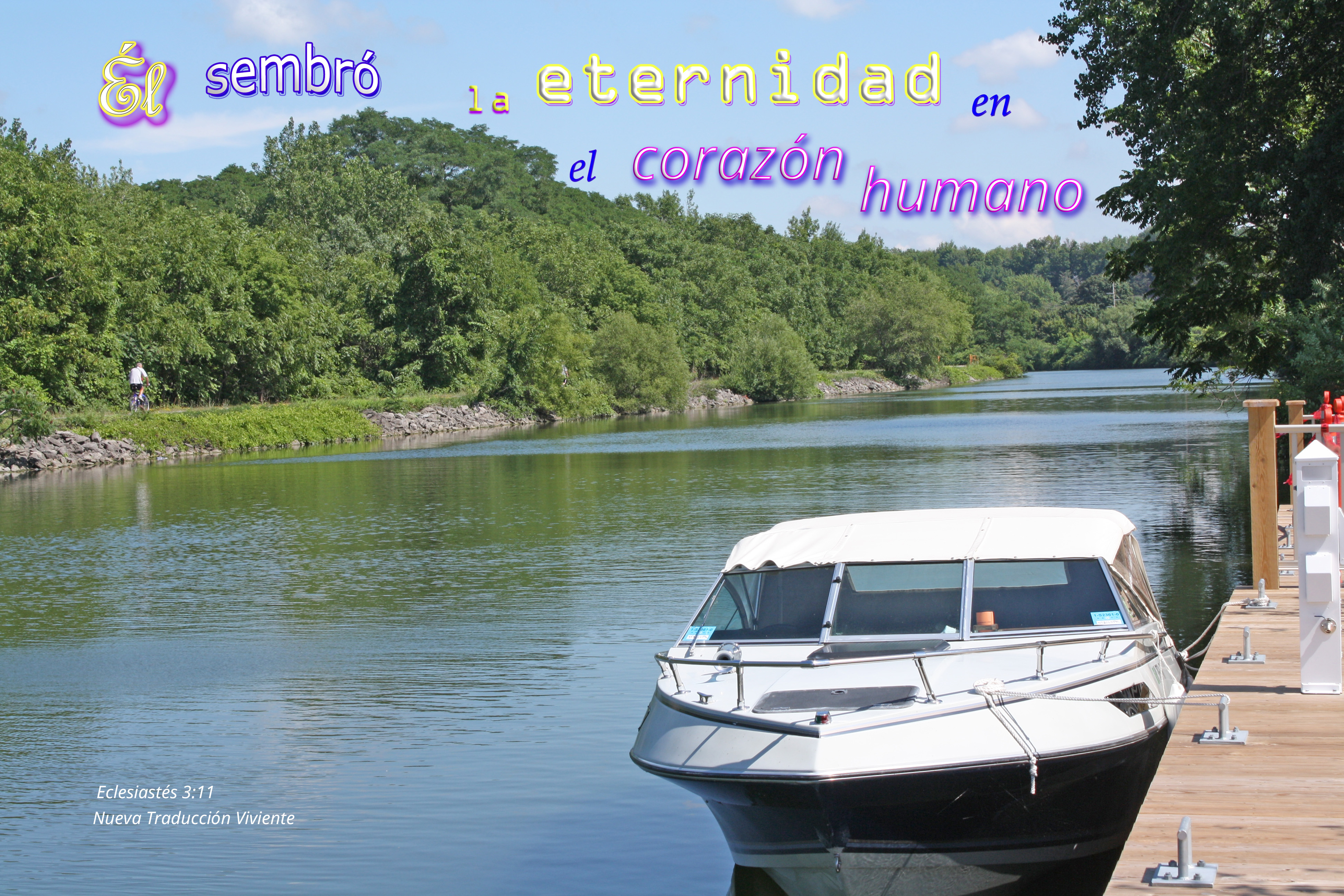 Boat and bicyclist along a canal with treesPhoto Title: Eternidad en el corazon humano