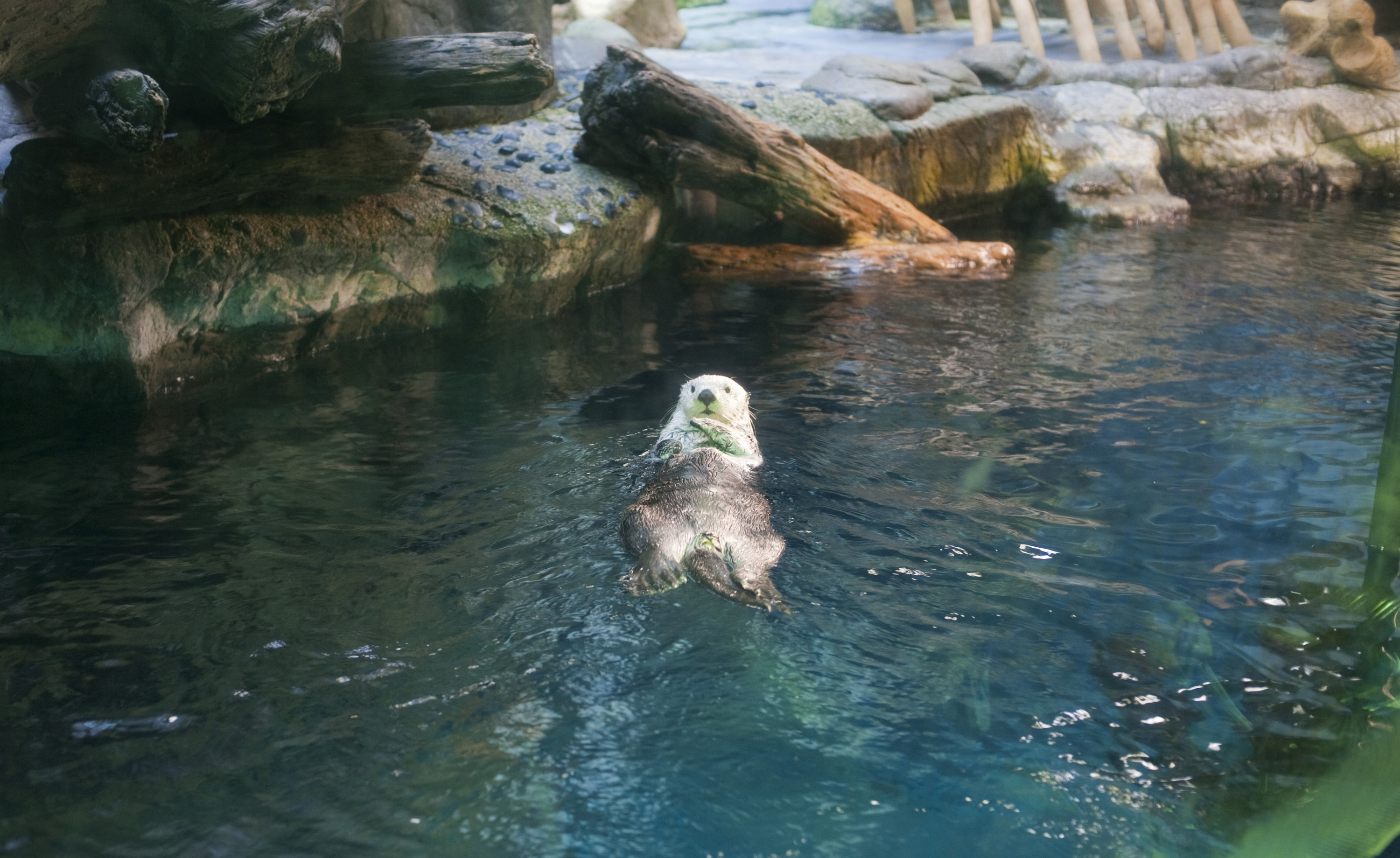 A captive otter floating on his back in an aquarium