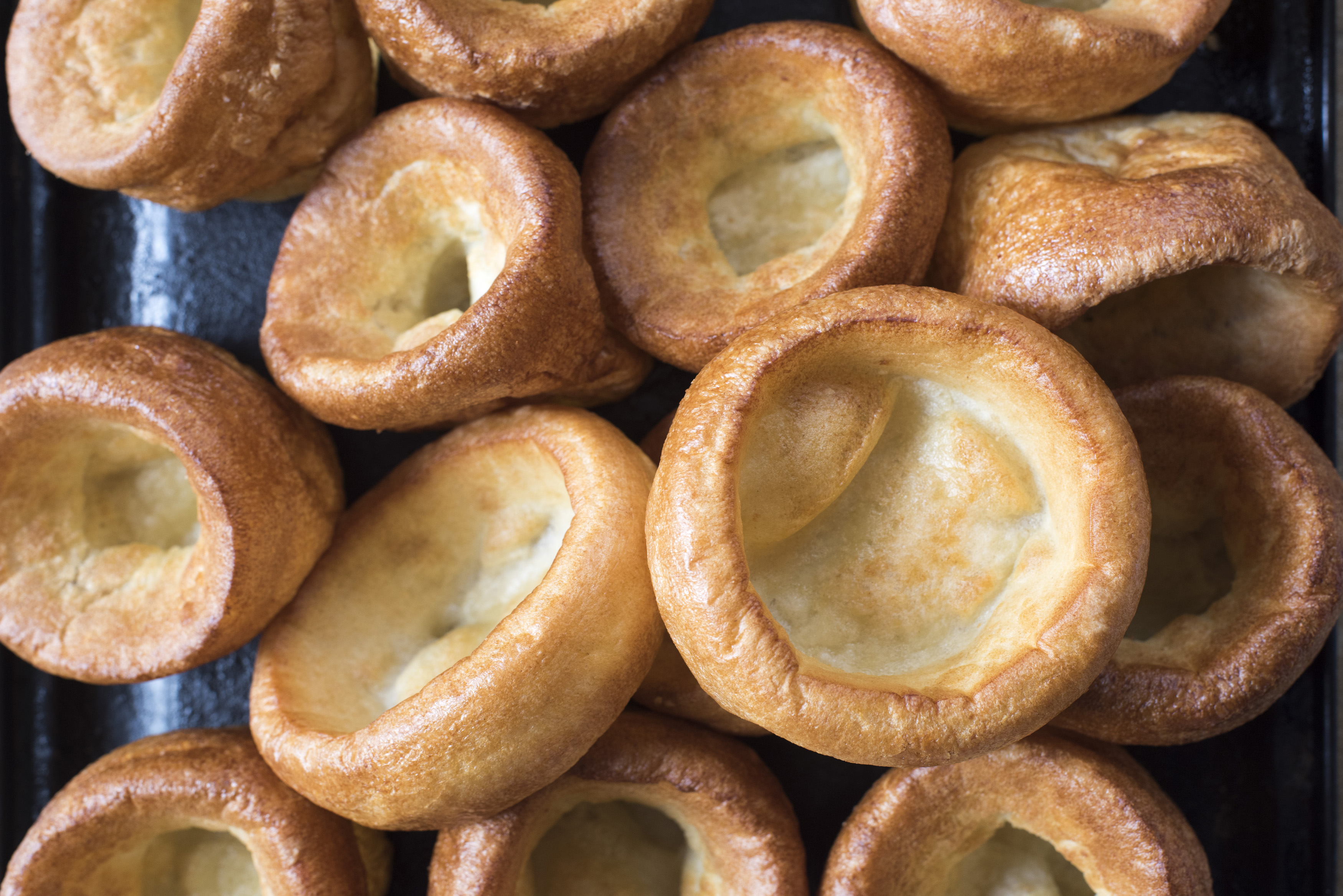 Background texture of individual golden puffy Yorkshire puddings fresh from the oven ready to be served with a roast meat dinner