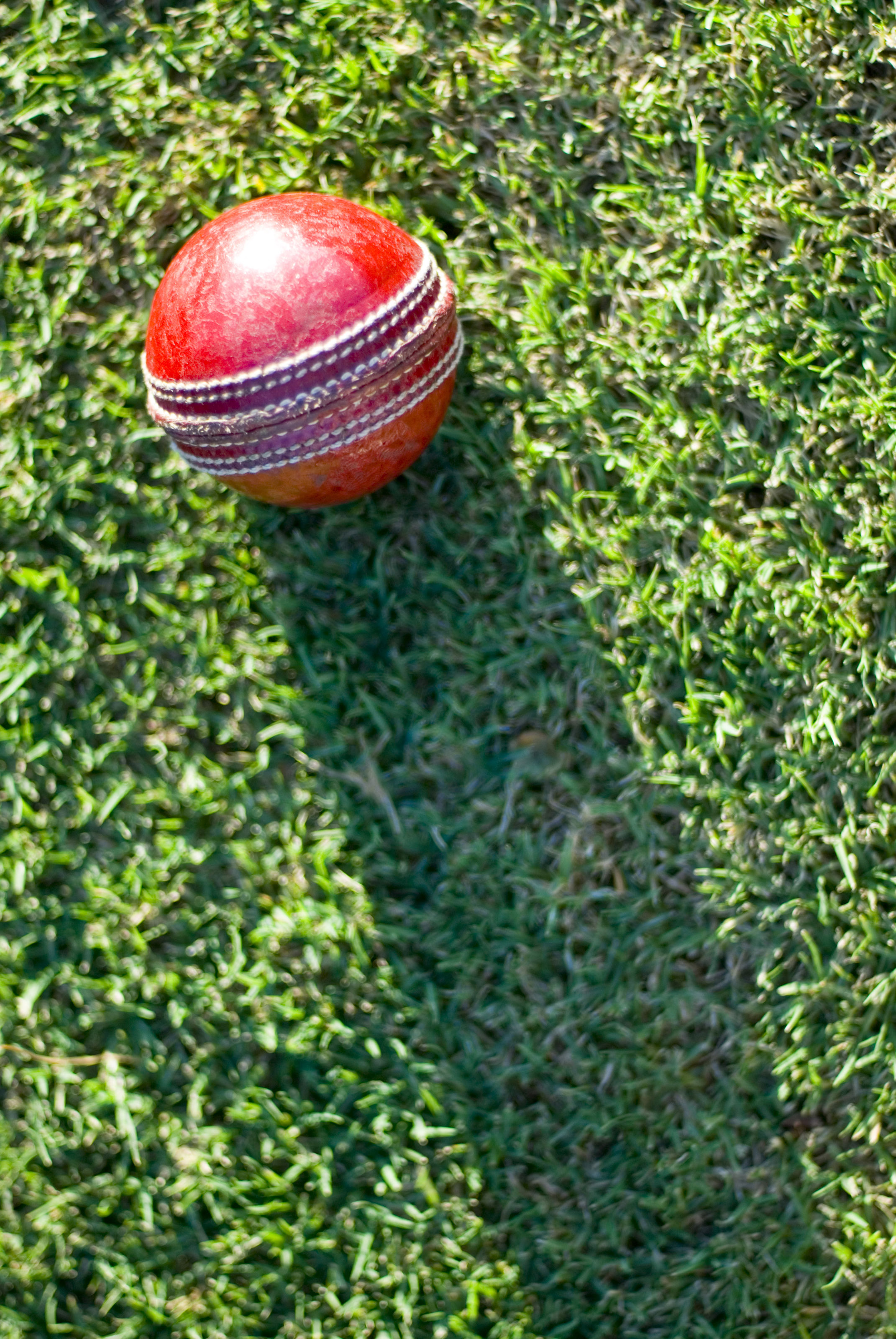 Keywords: sport, sports, cricket, ball, red, leather, traditional, green, grass, pitch, field, game, games, sporting, sun, shadow, playing field