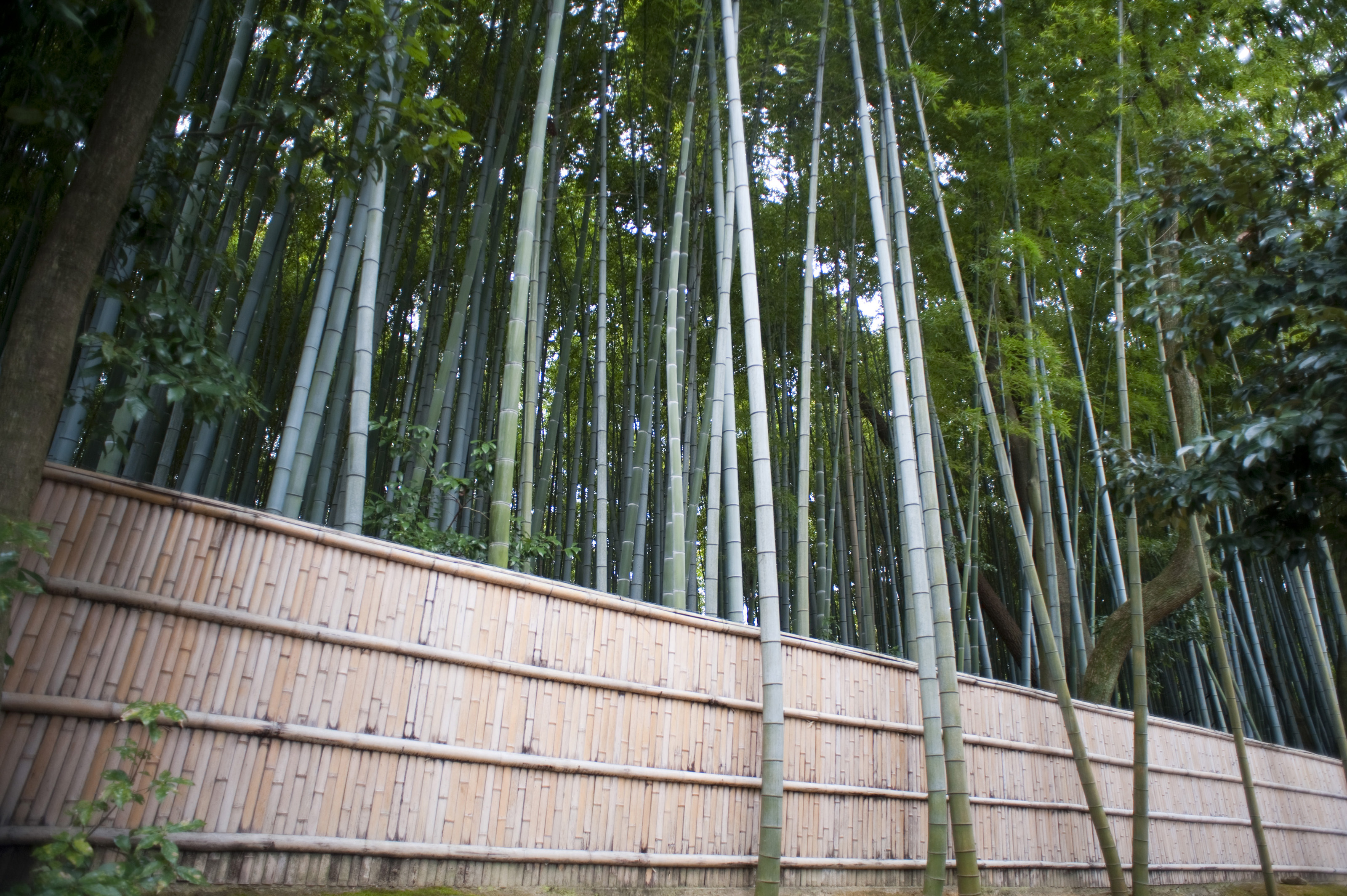 a bamboo fence and forest of tall bamboo trees, kyoto, japan