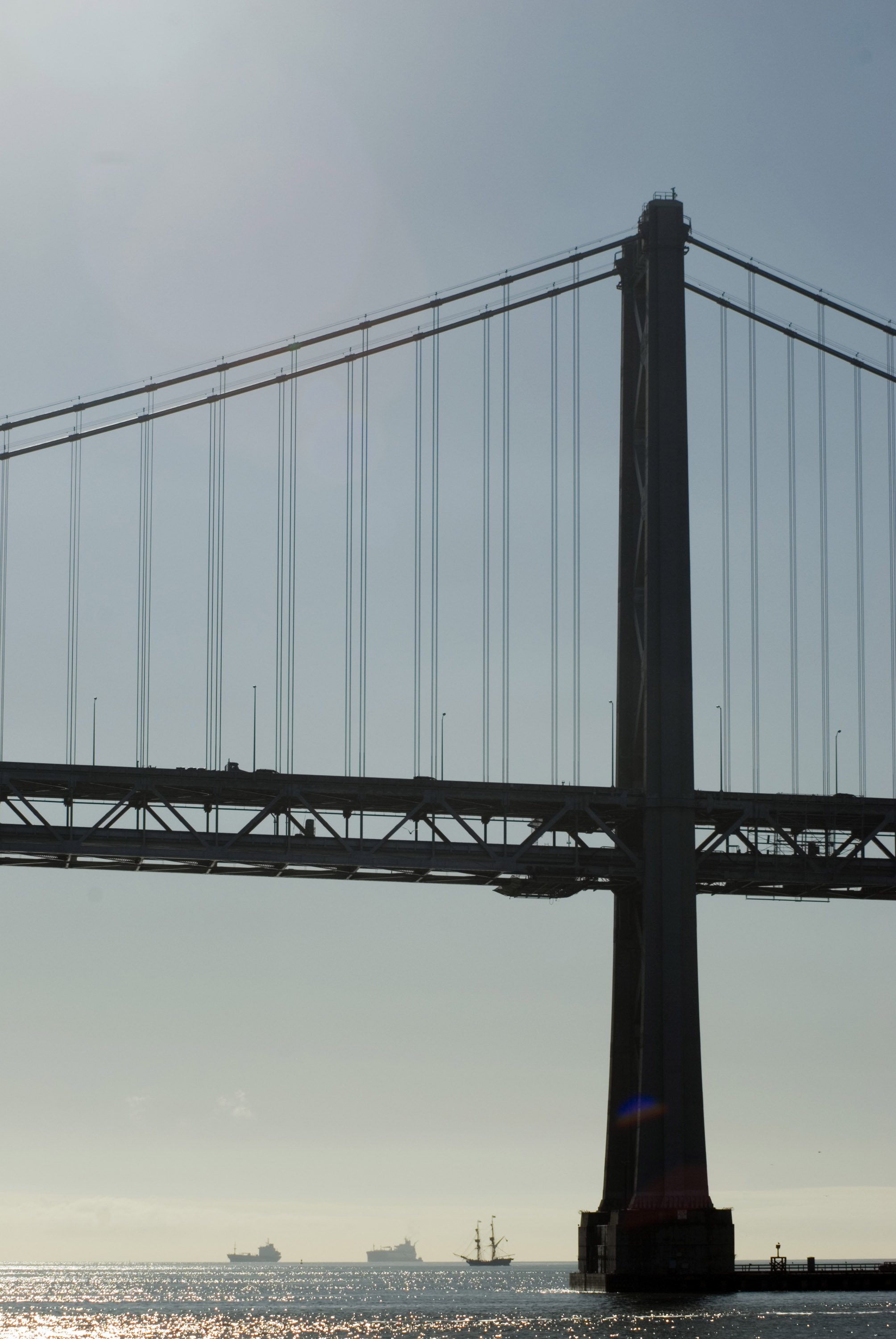 Keywords: san francisco bay bridge. suspension, bridge, structure, towers, wires, road, traffic, SF, california, water, tower, silhouette