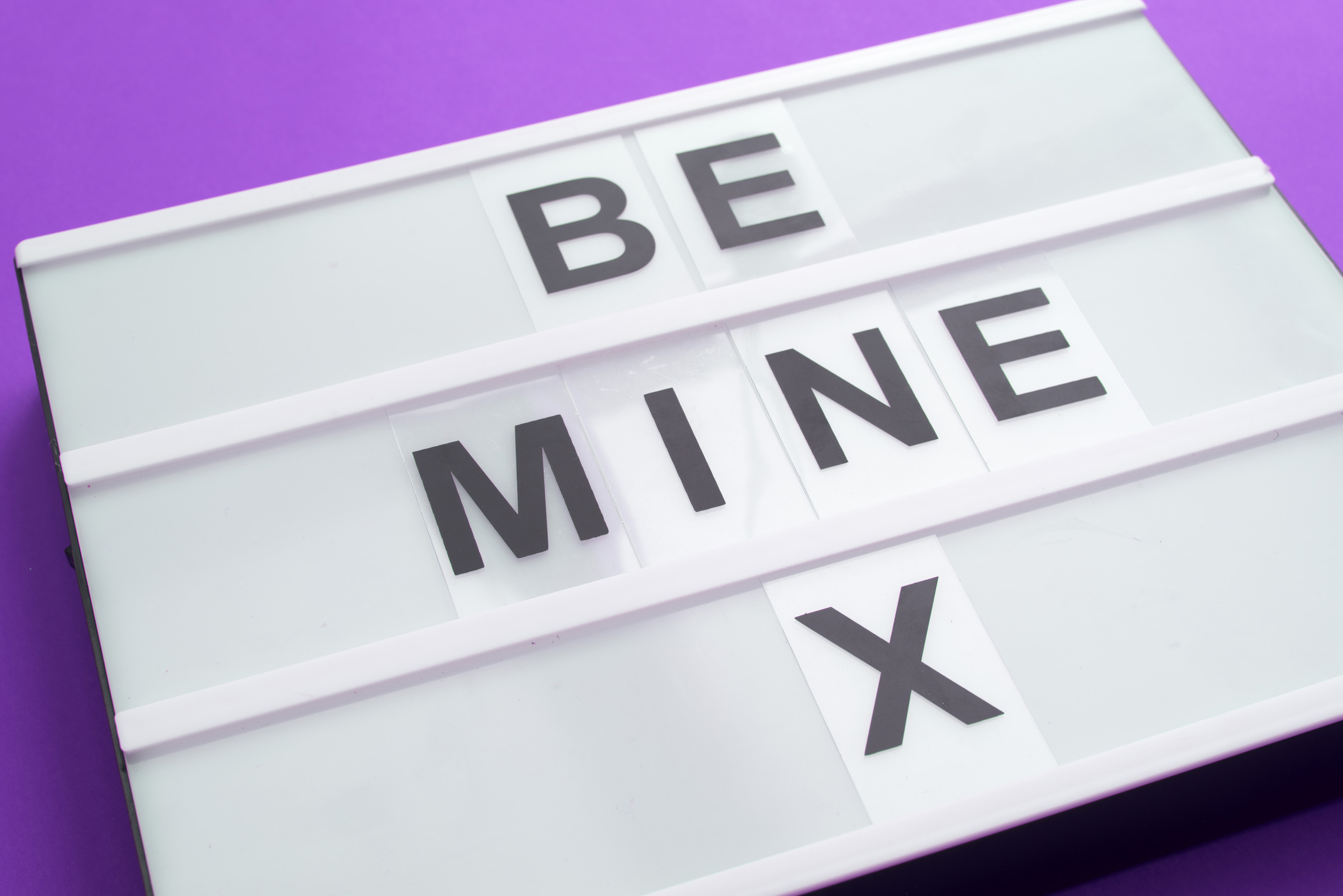 Close-up of white lightbox with BE MINE X message of black changeable letters over purple background