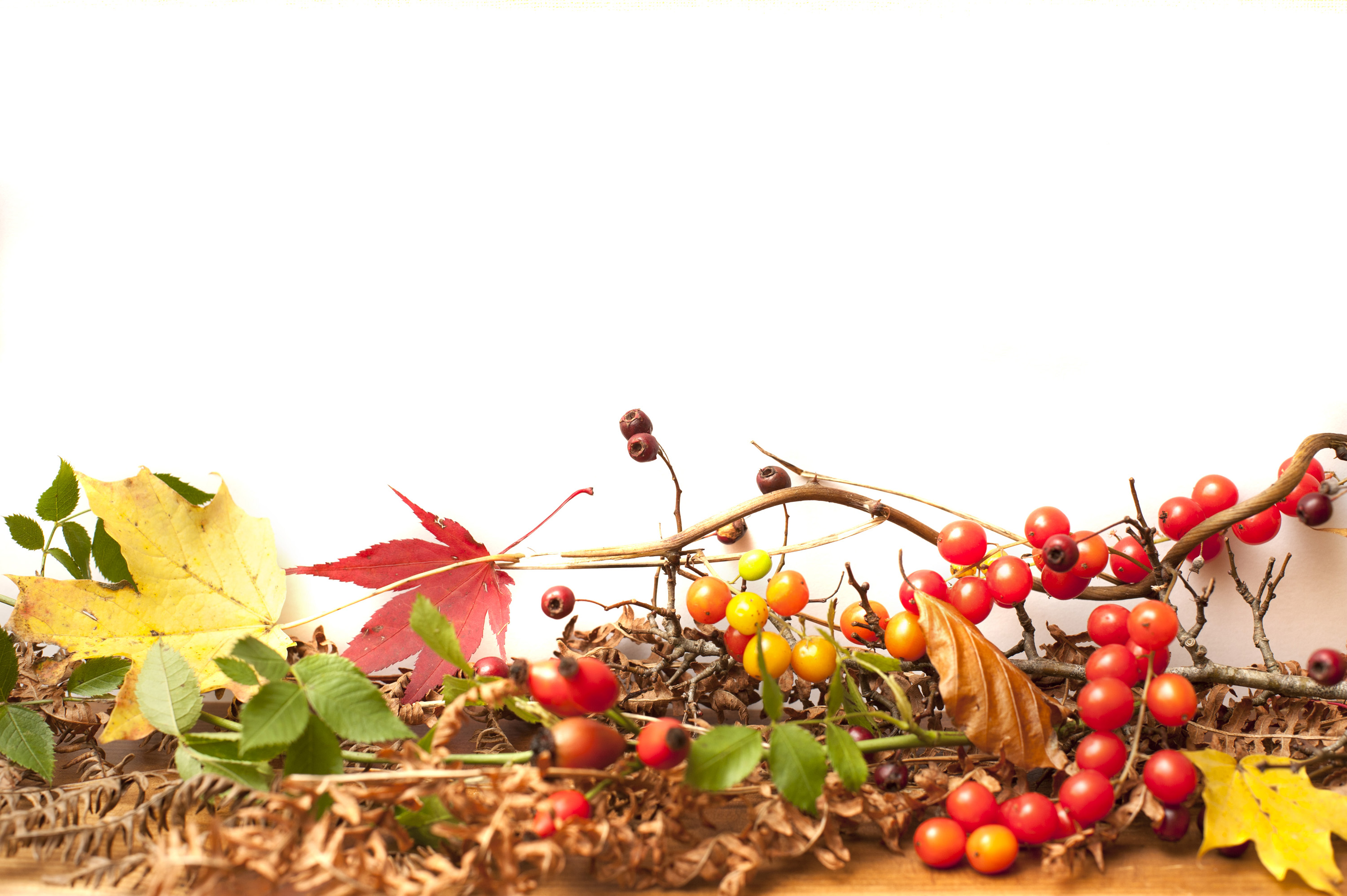 Keywords: halloween, autumn, leaves, berries, leaf, rose hip, rose hips, fruit, colorful, border, display, white, decorative, decoration, natural, nature, organic