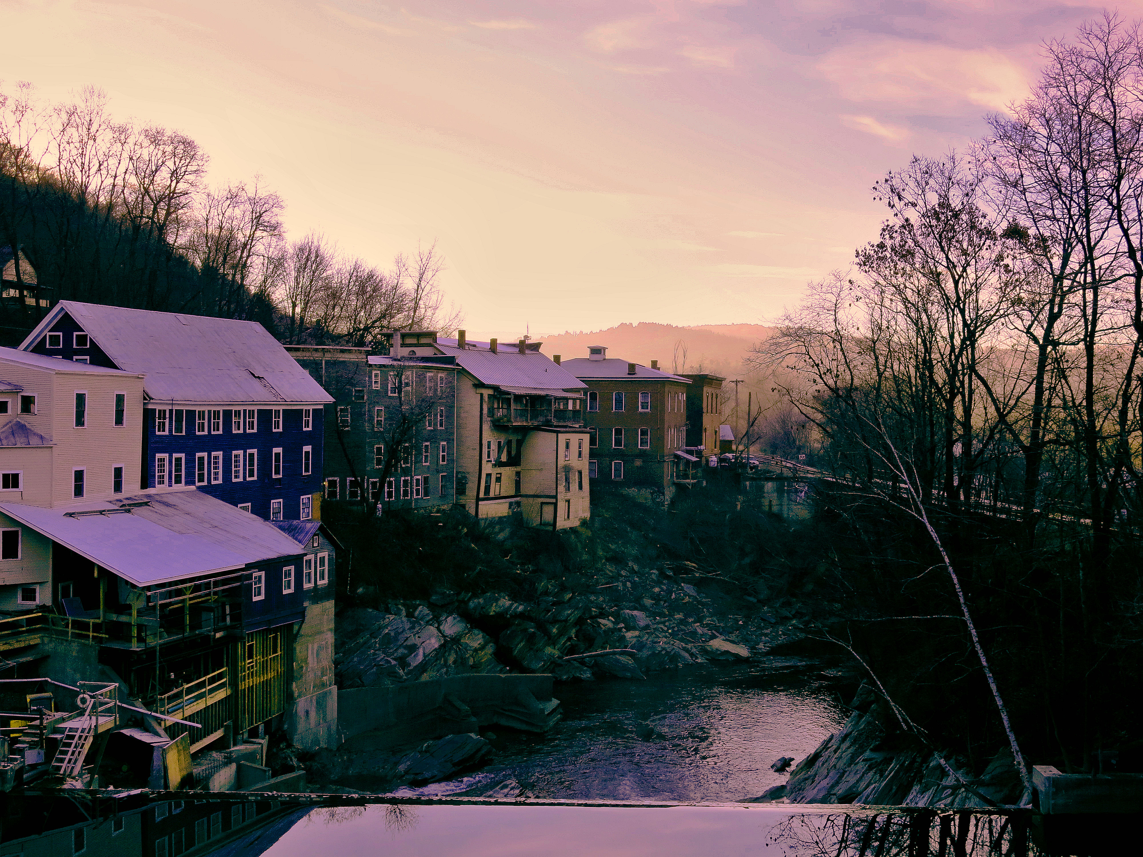 The back side of downtown Bethel, VT buildings on the river early in the morning.