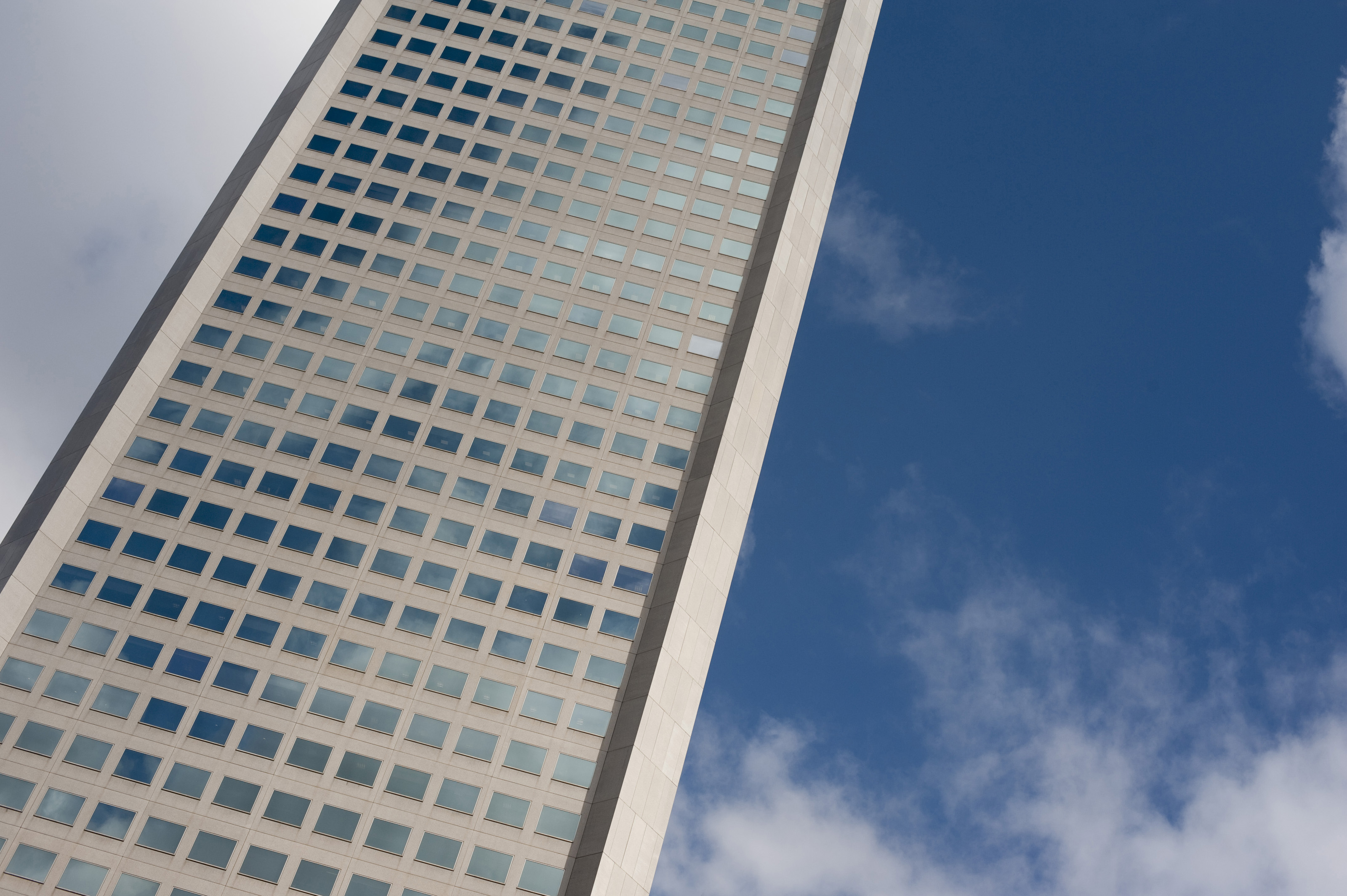 External facade of a corporate or big business office block with multiple windows reaching for the sky