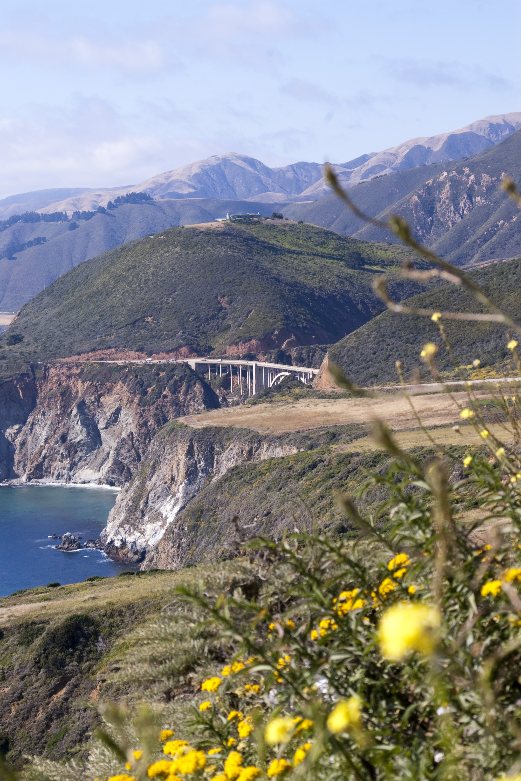 Keywords: california, monterey country, california, bixby, bridge, concerete, arch, oceanscape, coastal, bixby creek, cliffs, yellow, flowers, summer