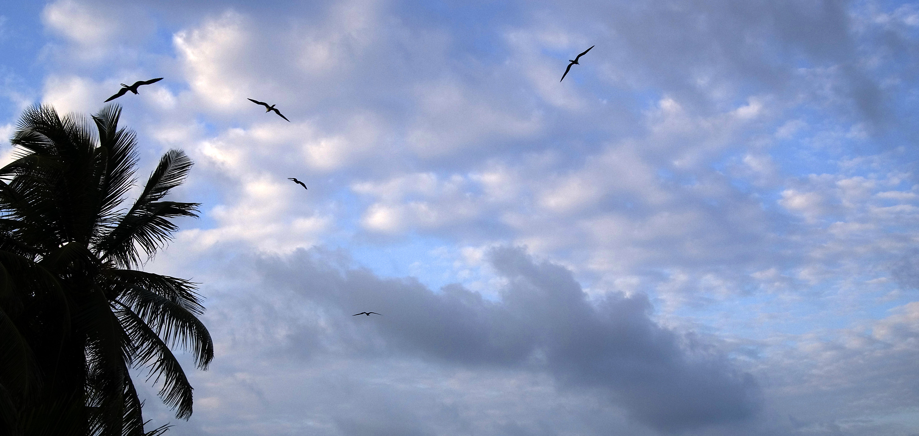 Keywords: belize, tropical, central america, palm, tree, sky, clouds, birds, circling, flight
