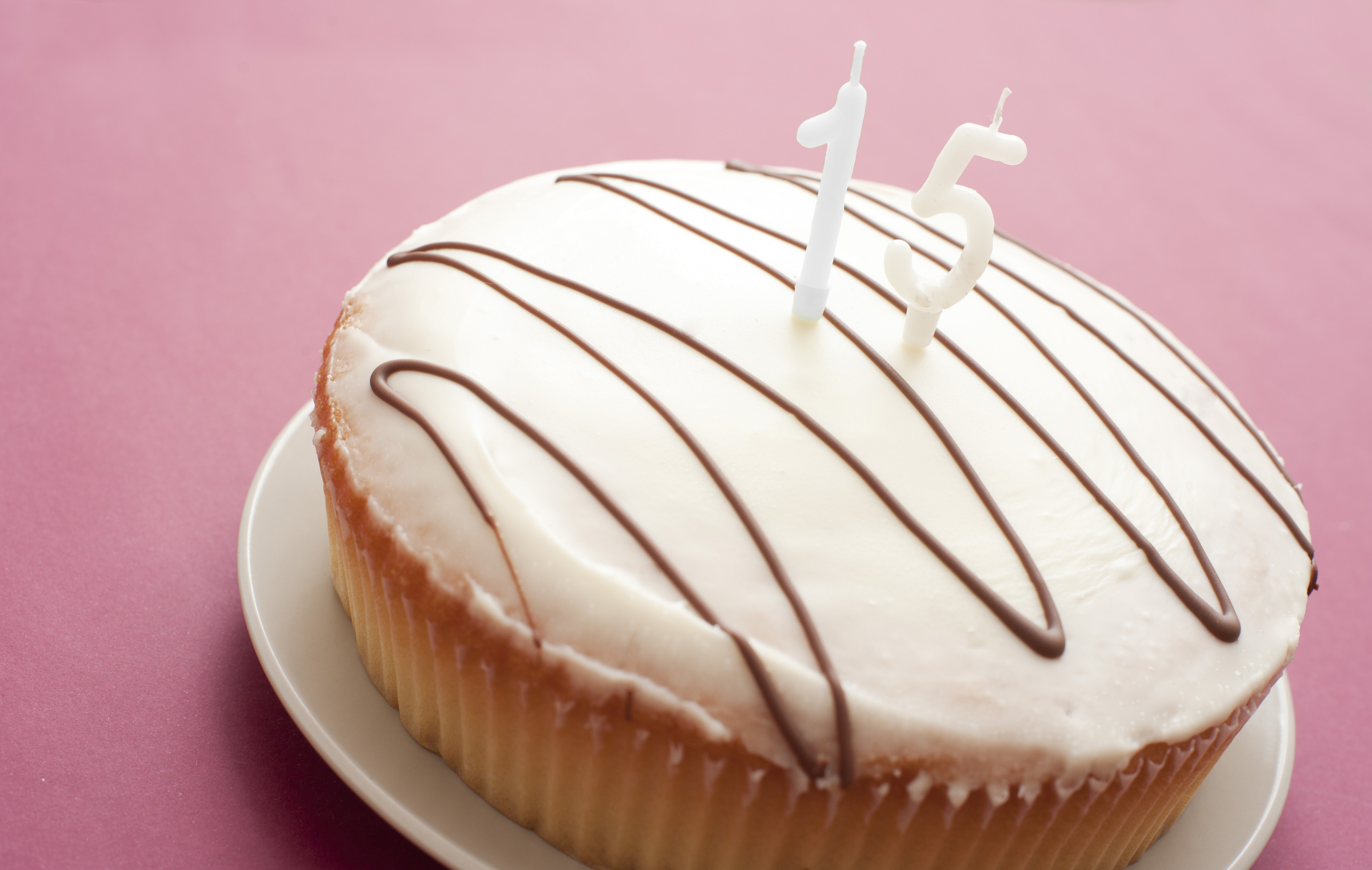 Iced fifteenth birthday cake with two unlit number 15 candles in the centre to celebrate the birthday of a teenager