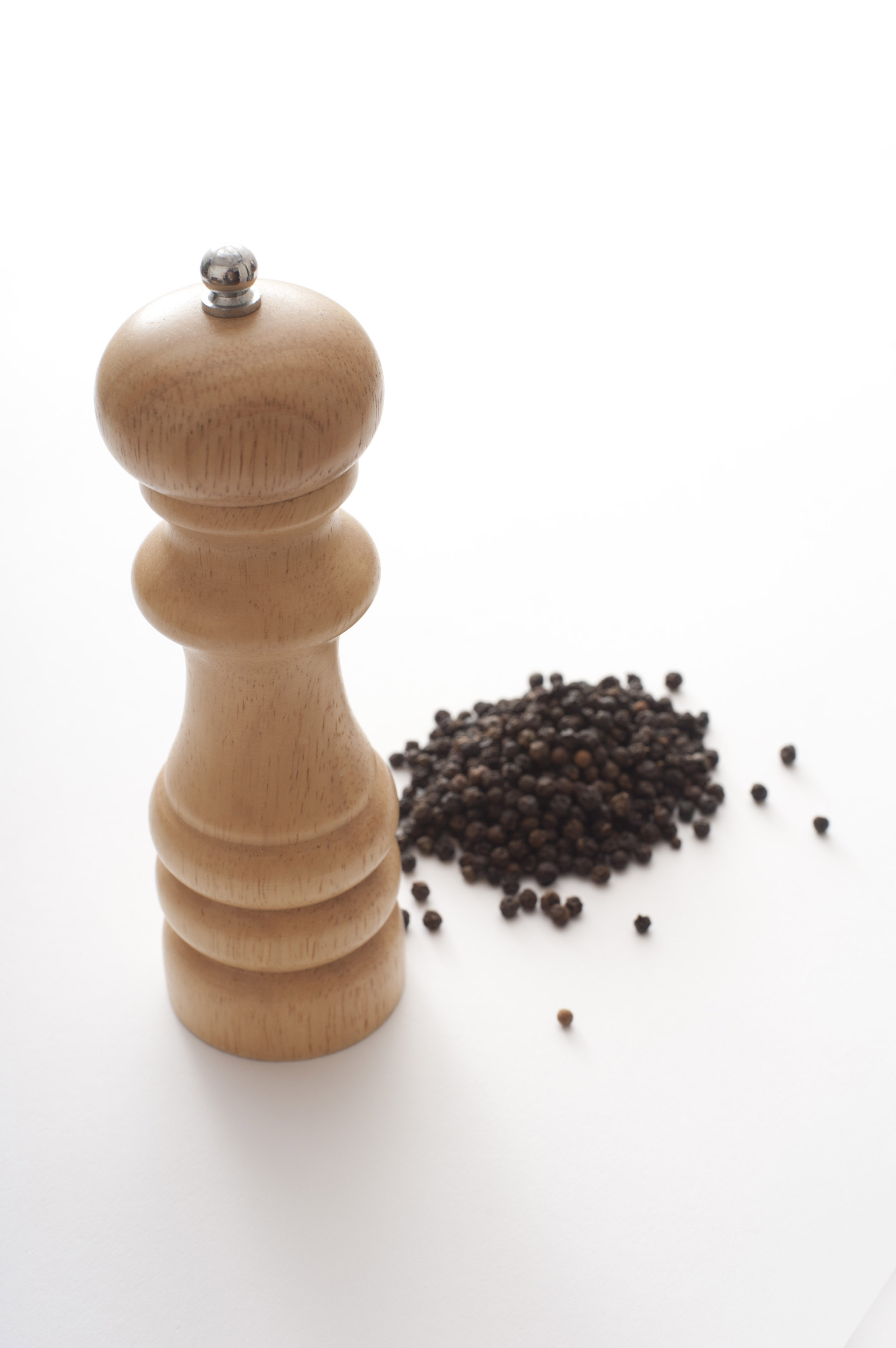 Keywords: cooking, flavoring, ingredient, seasoning, spice, black, condiment, dried, grinder, mill, pepper, peppercorns, pungent, copy space, on white