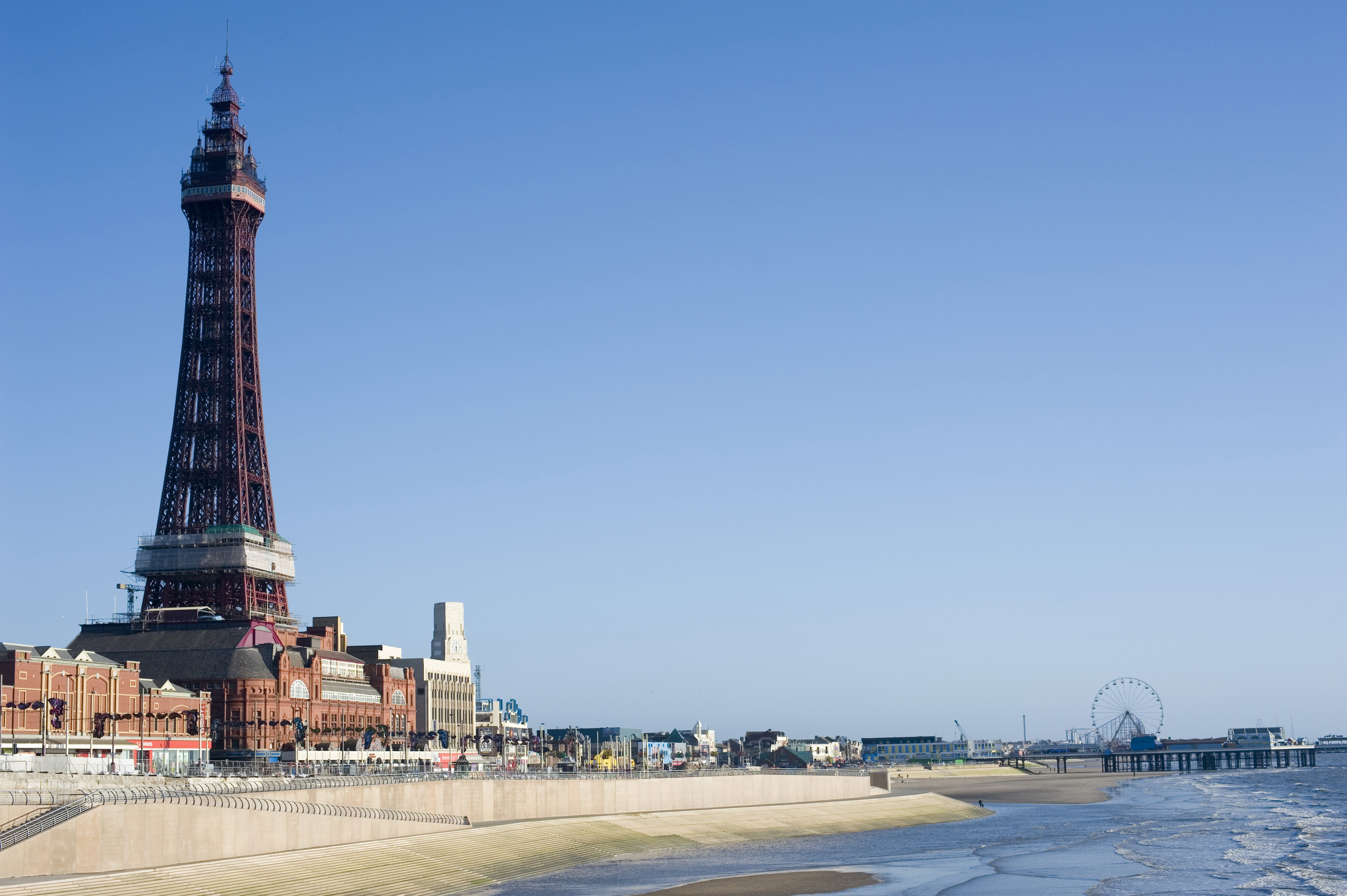 View along the sandy beach of the Blackpool watefront with the pier and Blackpool Tower on a beautiful sunny day with clear blue sky