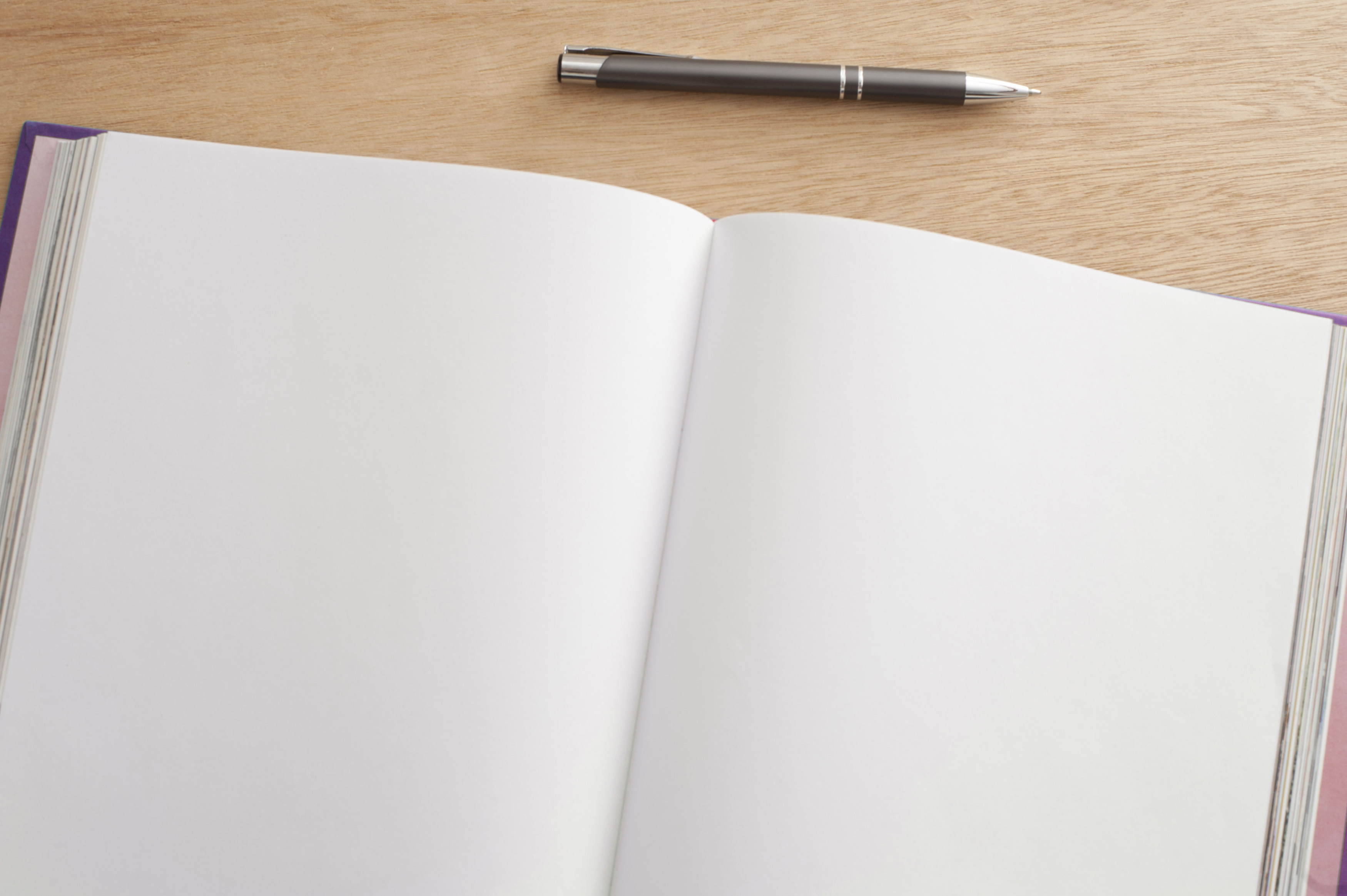 Keywords: blank, book, desk, double, journal, open, pages, pen, spread, write
