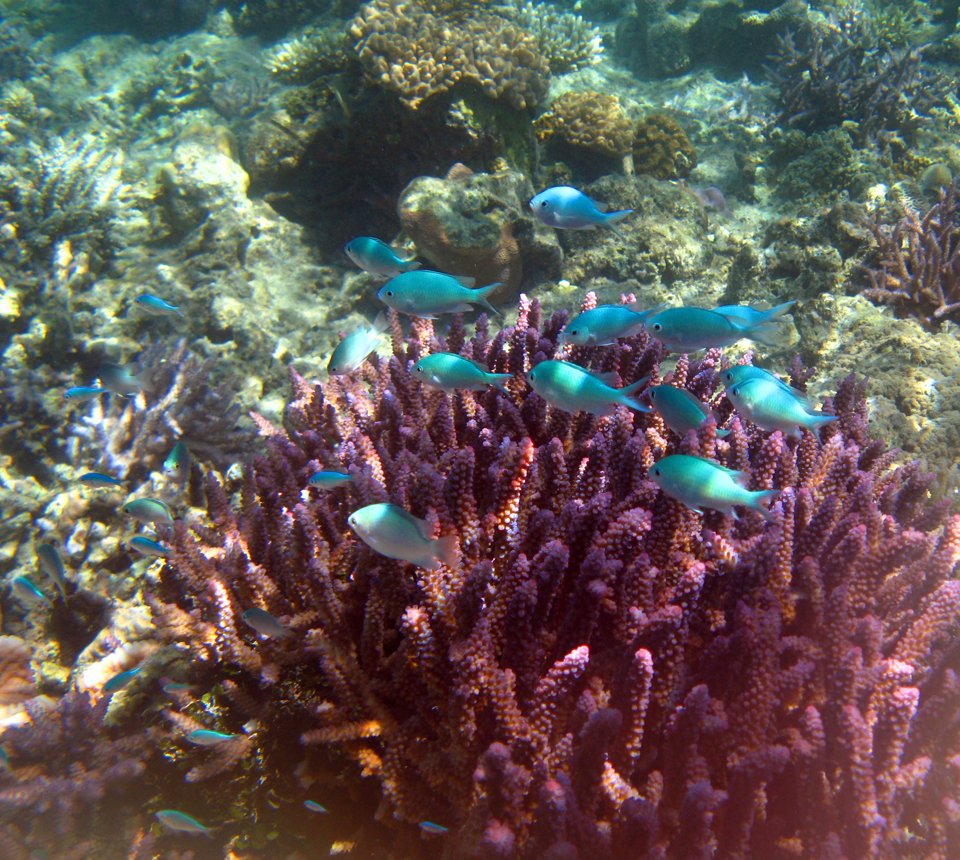 Keywords: blue, sunlight, small, water, tropical, swimming, fish, aquatic, underwater, coral, diving, reef, fiji, dappled, shoal