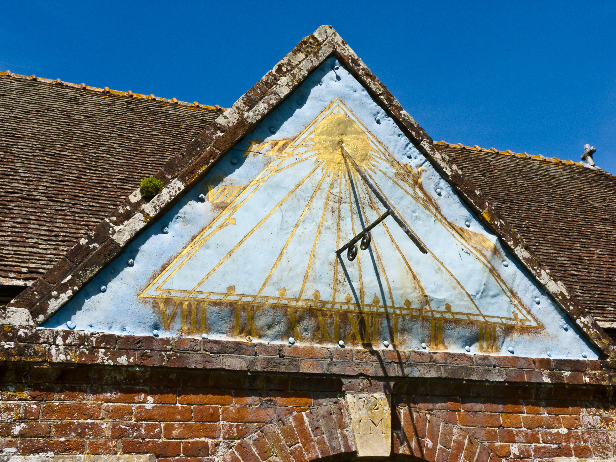 Keywords: Blue, Time, Sun, Sundial, Clock, Solar, Entrance, Gable, Triangle, Brick, Tiles