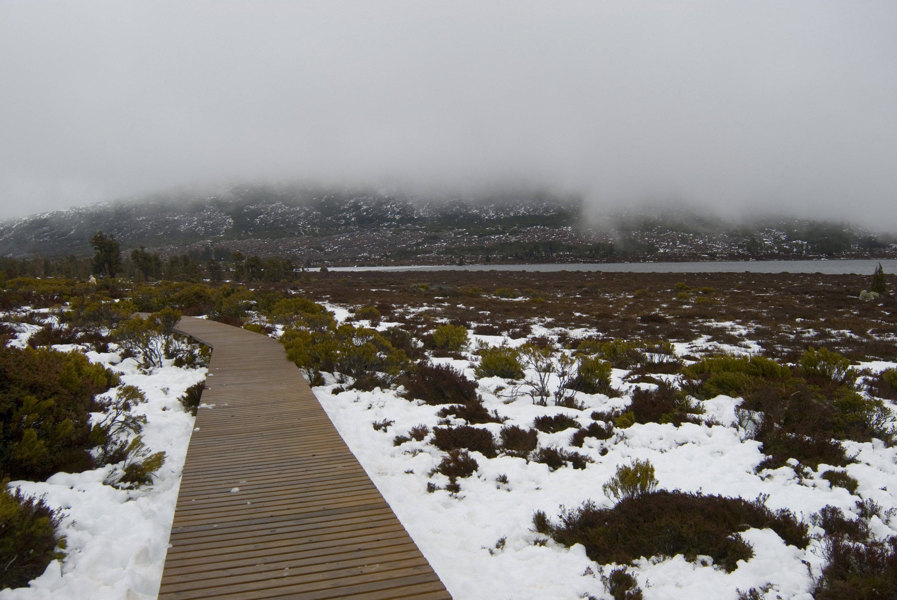 Keywords: wooden, landscape, winter, snow, freezing, walkway, habitat, deserted, marsh, conservation, australia, preservation, bleak, tasmania, broadwalk
