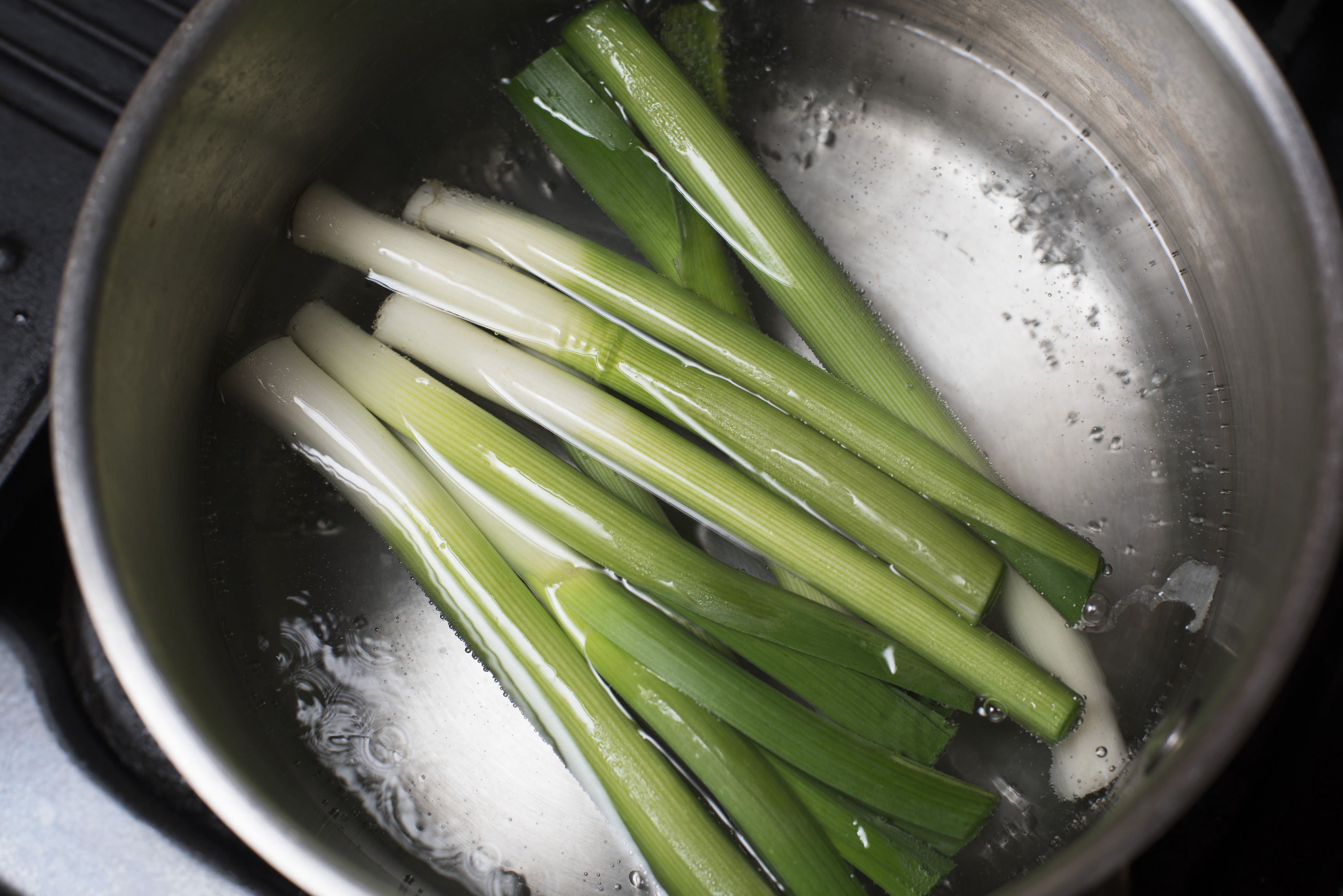 Overhead view of a pot boiling with water and half a dozen green onions cut at both ends