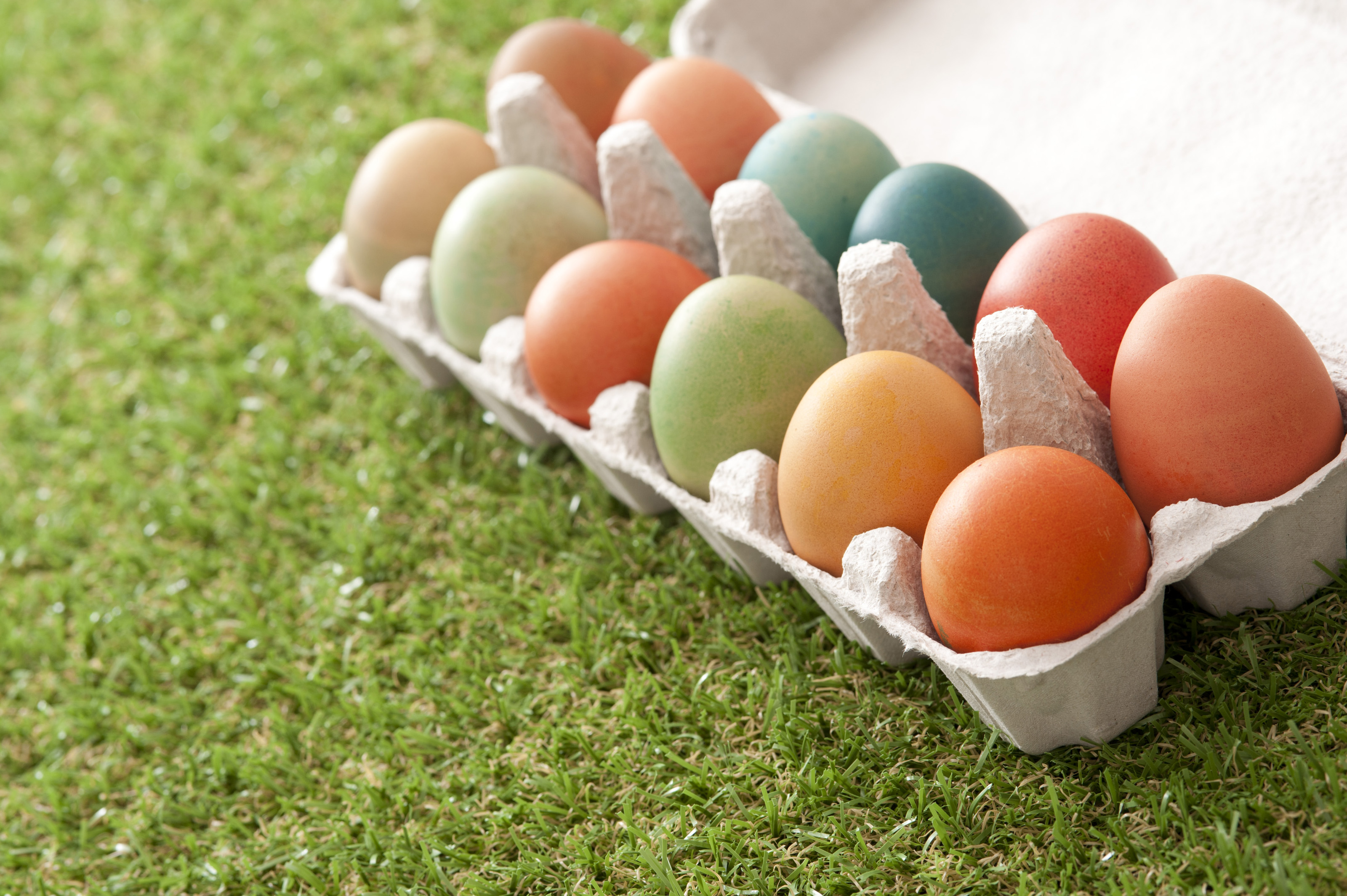 Keywords: colorful, dyed, easter, eggs, holiday, box, carton, copy space, full, grass, spring, homemade, kids, tradition, multicolored