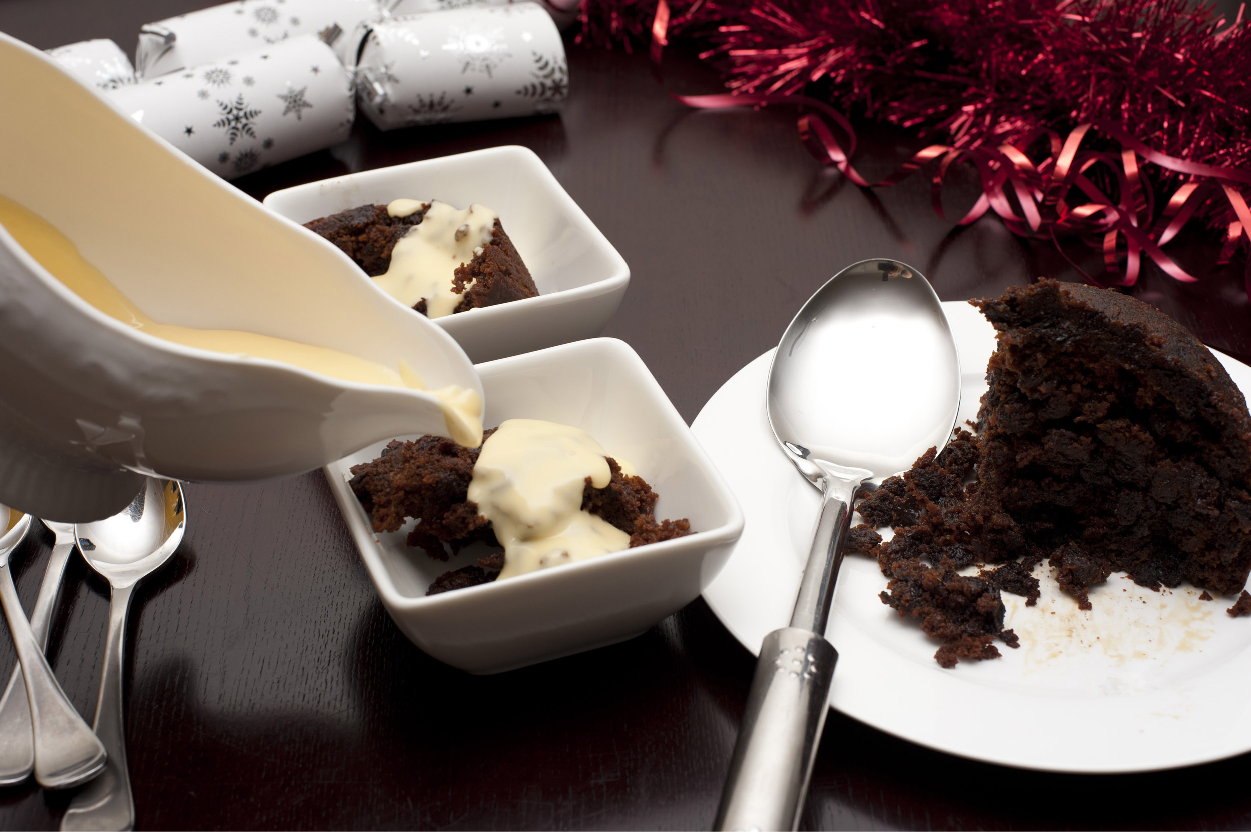 Pouring brandy custard onto servings of delicious fruity Christmas pudding on a festive table with ornaments and Xmas crackers
