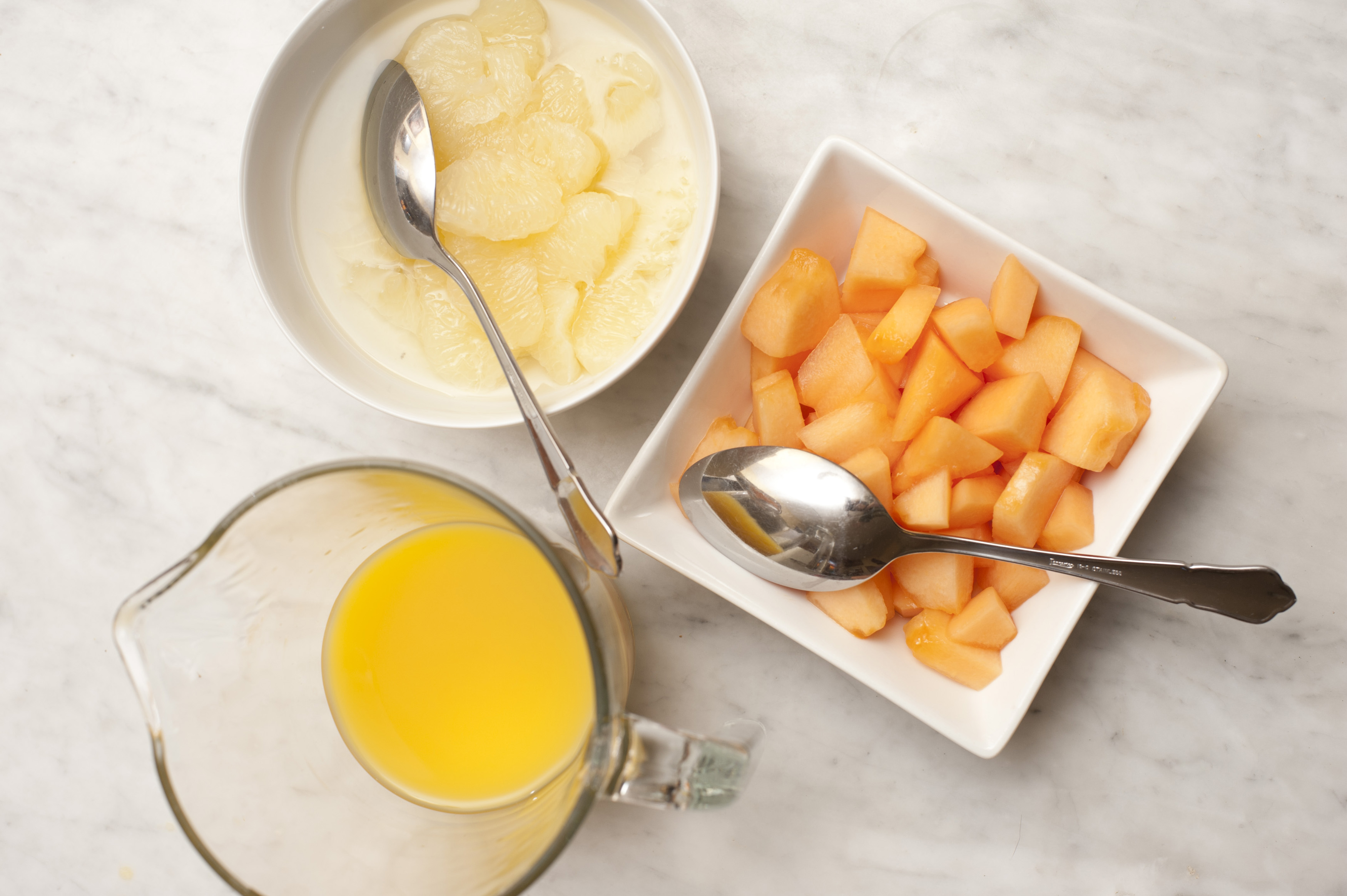 Keywords: above, bowl, breakfast, dish, food, fresh, fruit, healthy, jug, juice, melon, orange, pitcher, spoon, tropical