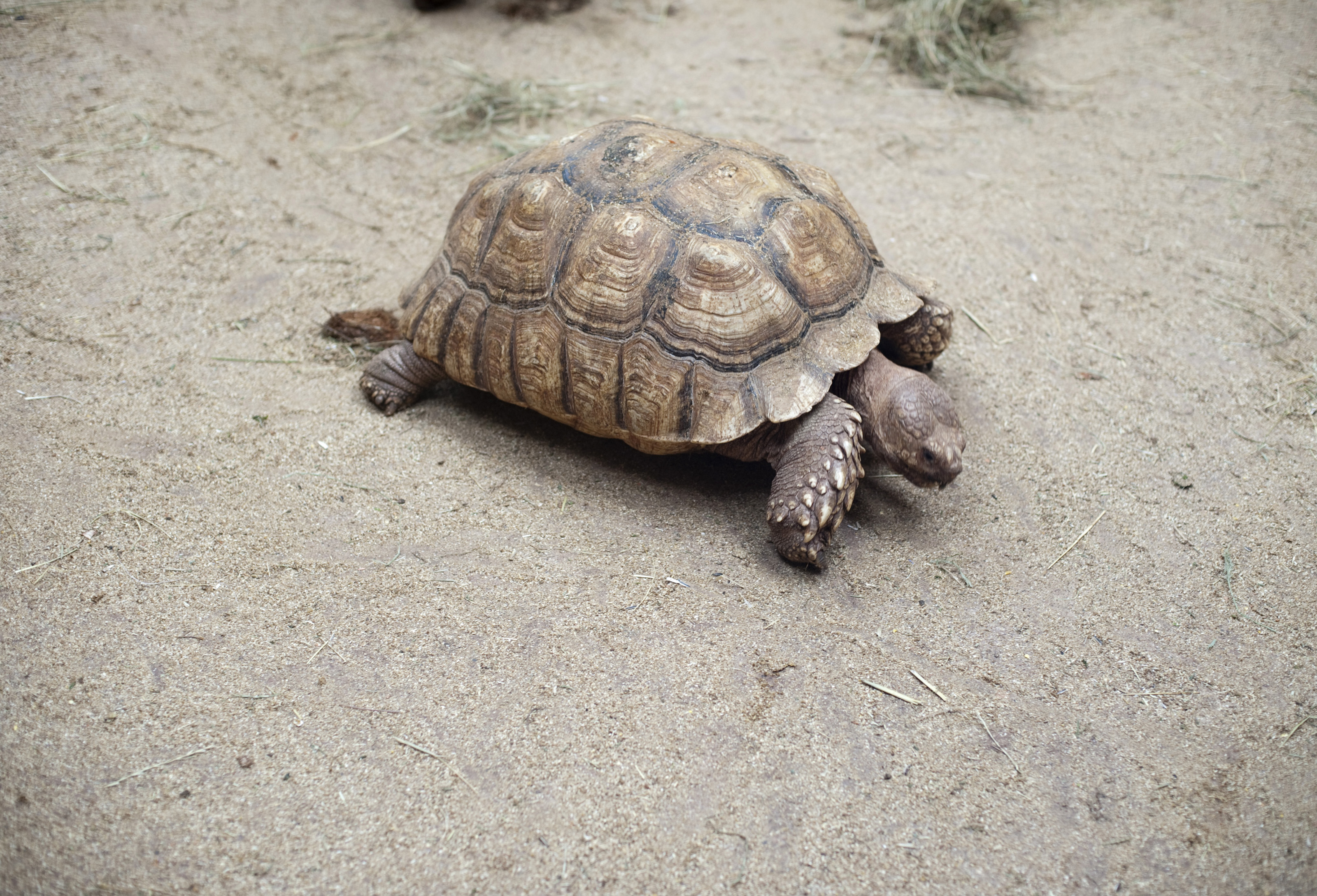 Tortoise in captivity walking across dry ground sprinkled with the remnants of dry hay with copyspace