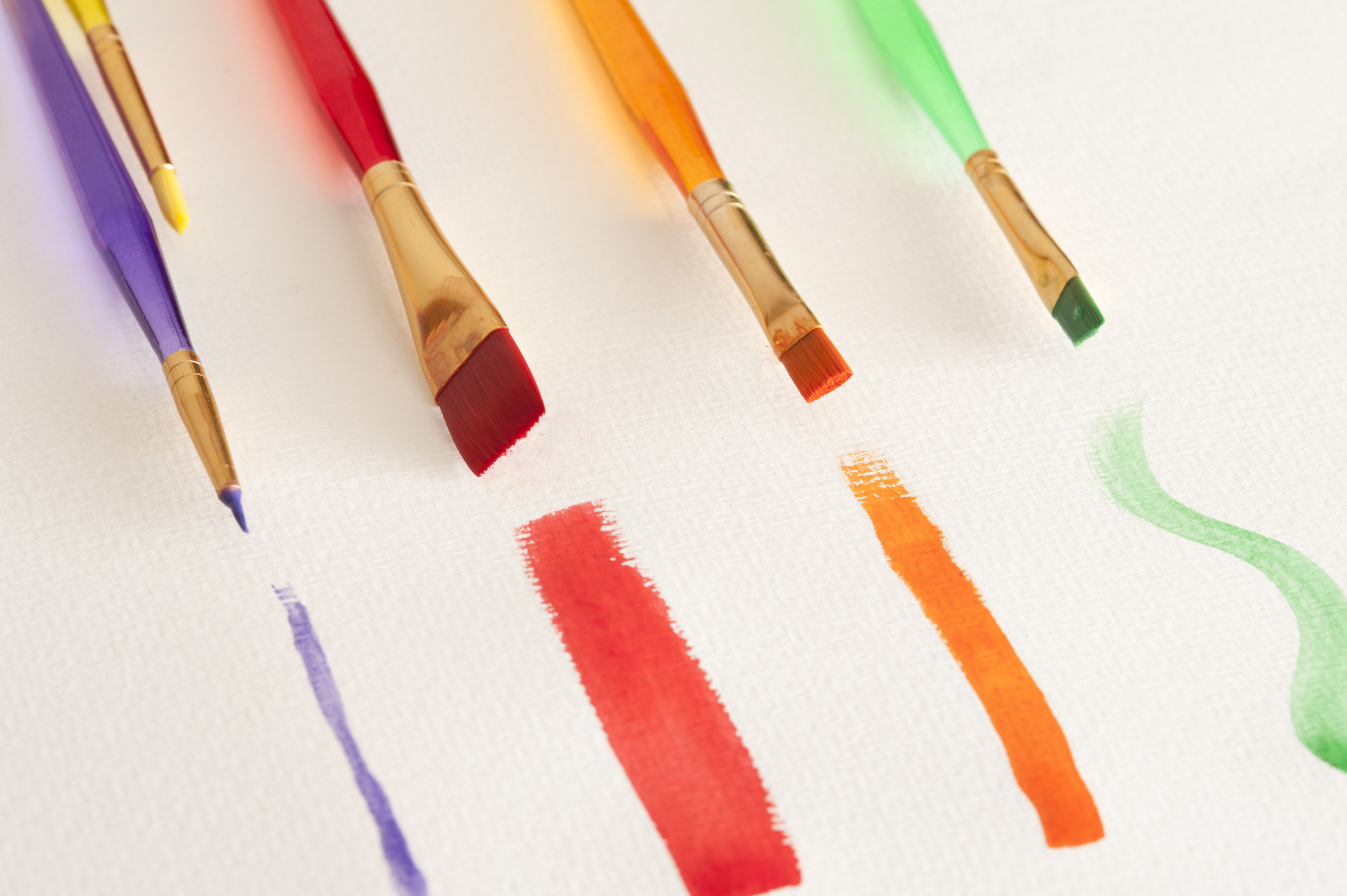 Thin, thick and medium plastic handle paintbrushes with purple, red, orange and green watercolor paintstrokes on white canvas paper
