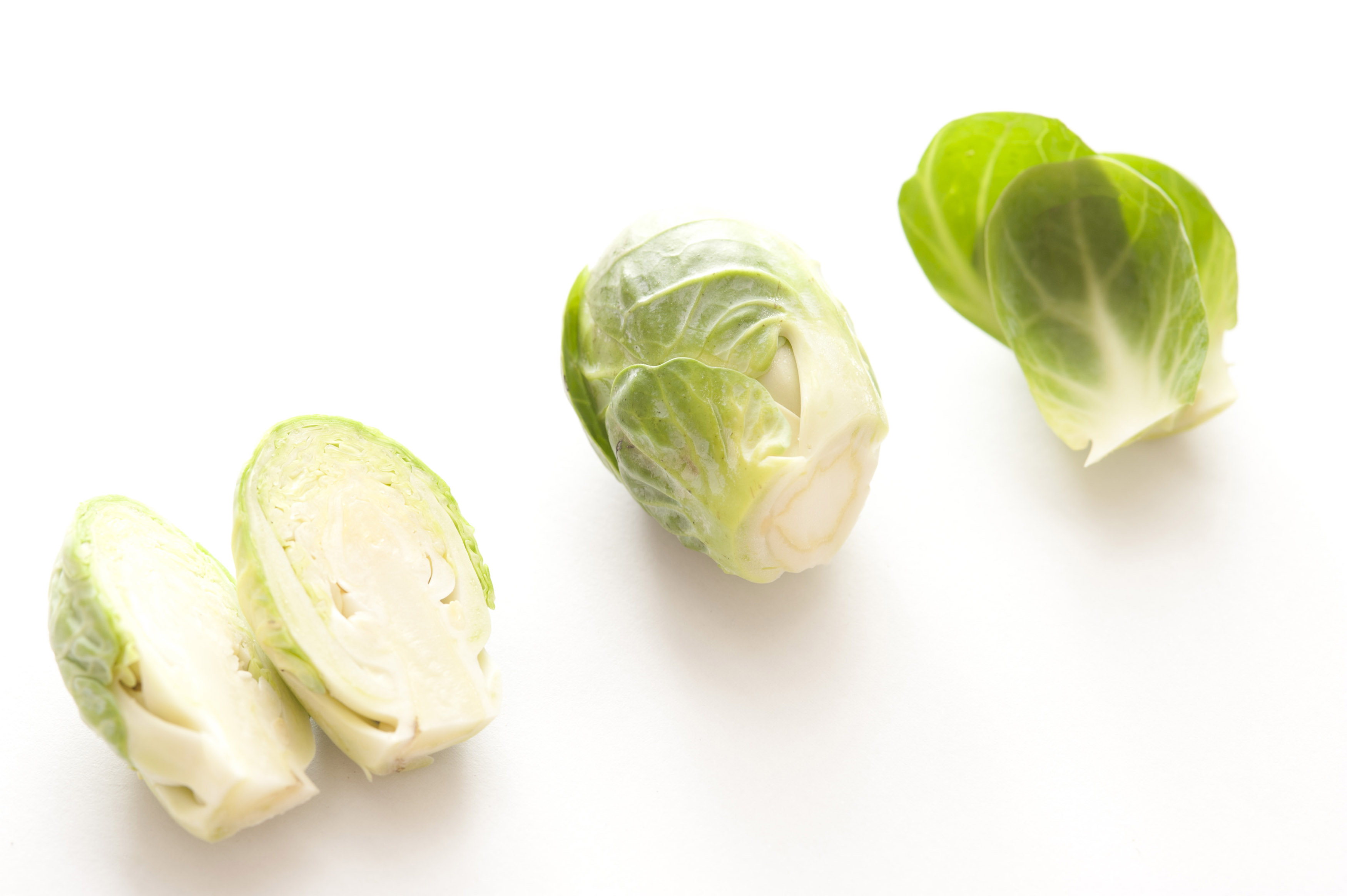 Keywords: copy space, food, fresh, raw, uncooked, vegetable, veggie, brussel sprouts, halved, sliced, diagonal, line, leaves, on white, whole