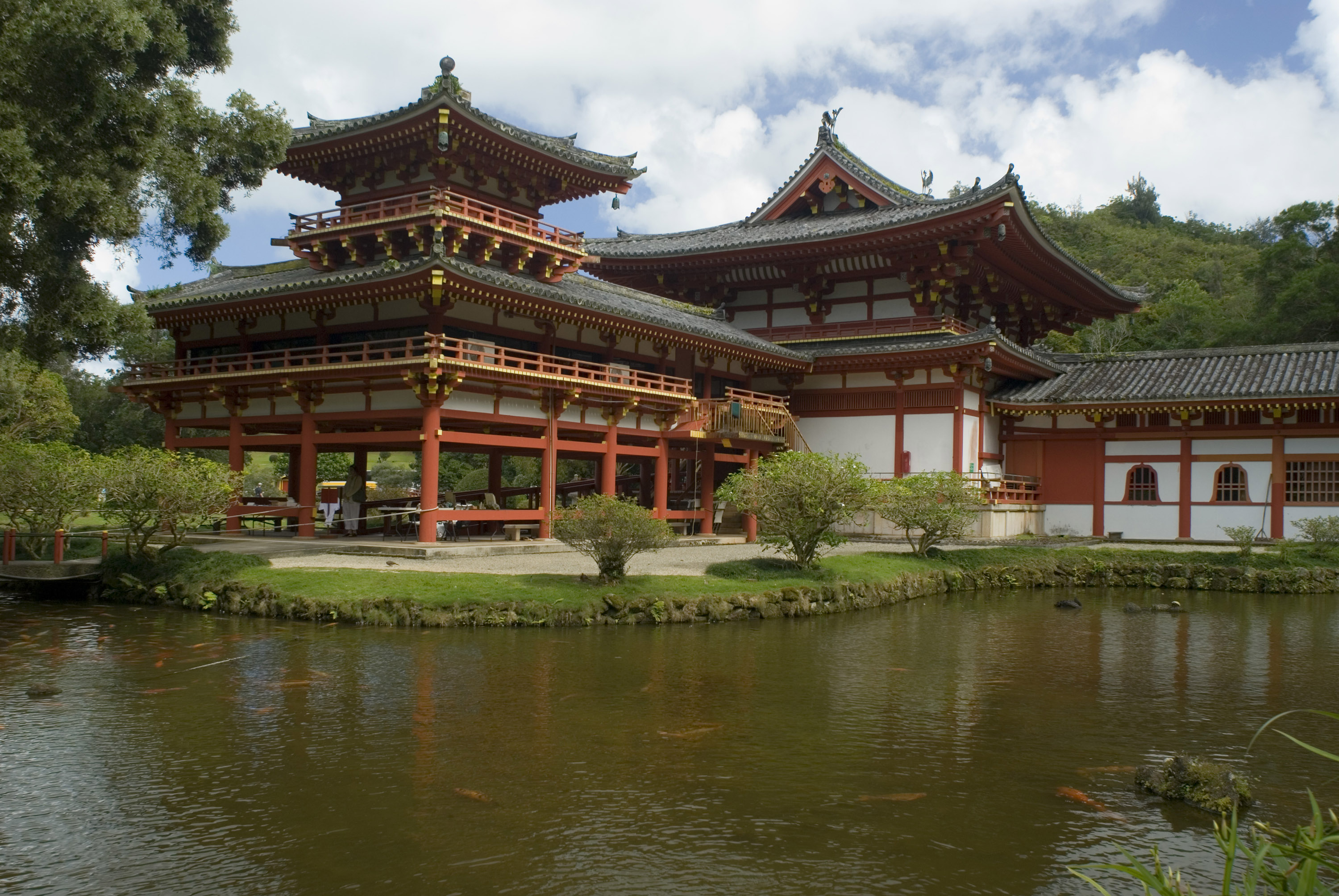 Keywords: replica, temple, japaniese, hawaii, oahu, gardens, red, buddist, pond, trees, green, attraction, worship, prey, hawaiian, Byodo-In