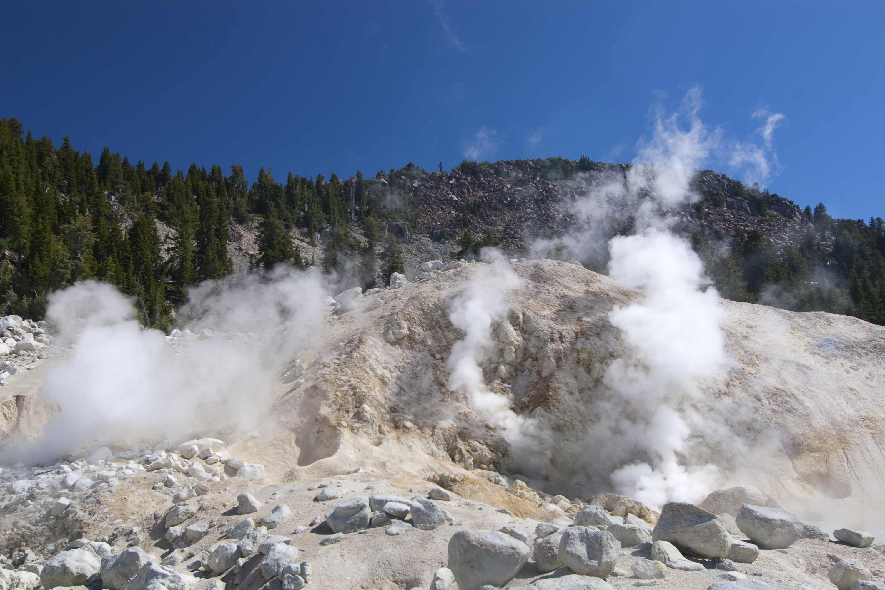 Fumeroles vent hot gas and steam at Bumpass Hell, the Lassen Volcanic National Park